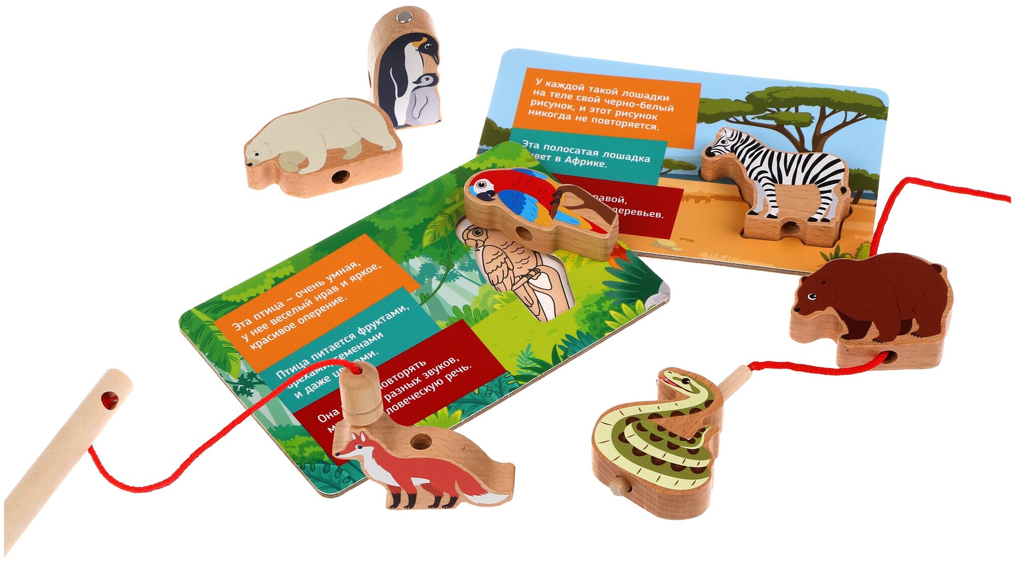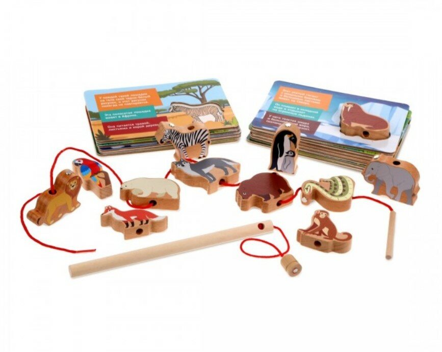 С фигурками животных можно играть отдельно, придумывая сценки и даже сочиняя собственные сказки. Фигурки можно ловить на магнитную удочку, тренируя координацию движений. А еще в фигурках есть отверстия, чтобы собирать их, как бусы, на длинный шнурок с деревянной ручкой.