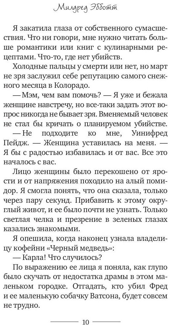 Открытие книжного магазина в Эстес-Парке - это воплощение мечты: очарование маленького городка, запах свежеиспеченного хлеба и чтение детективов у камина. Но безмятежные дни омрачаются внезапным происшествием - в пекарне своей подруги Уинифред находит труп, а главным подозреваемым в деле оказывается брат ее главной неприятельницы.