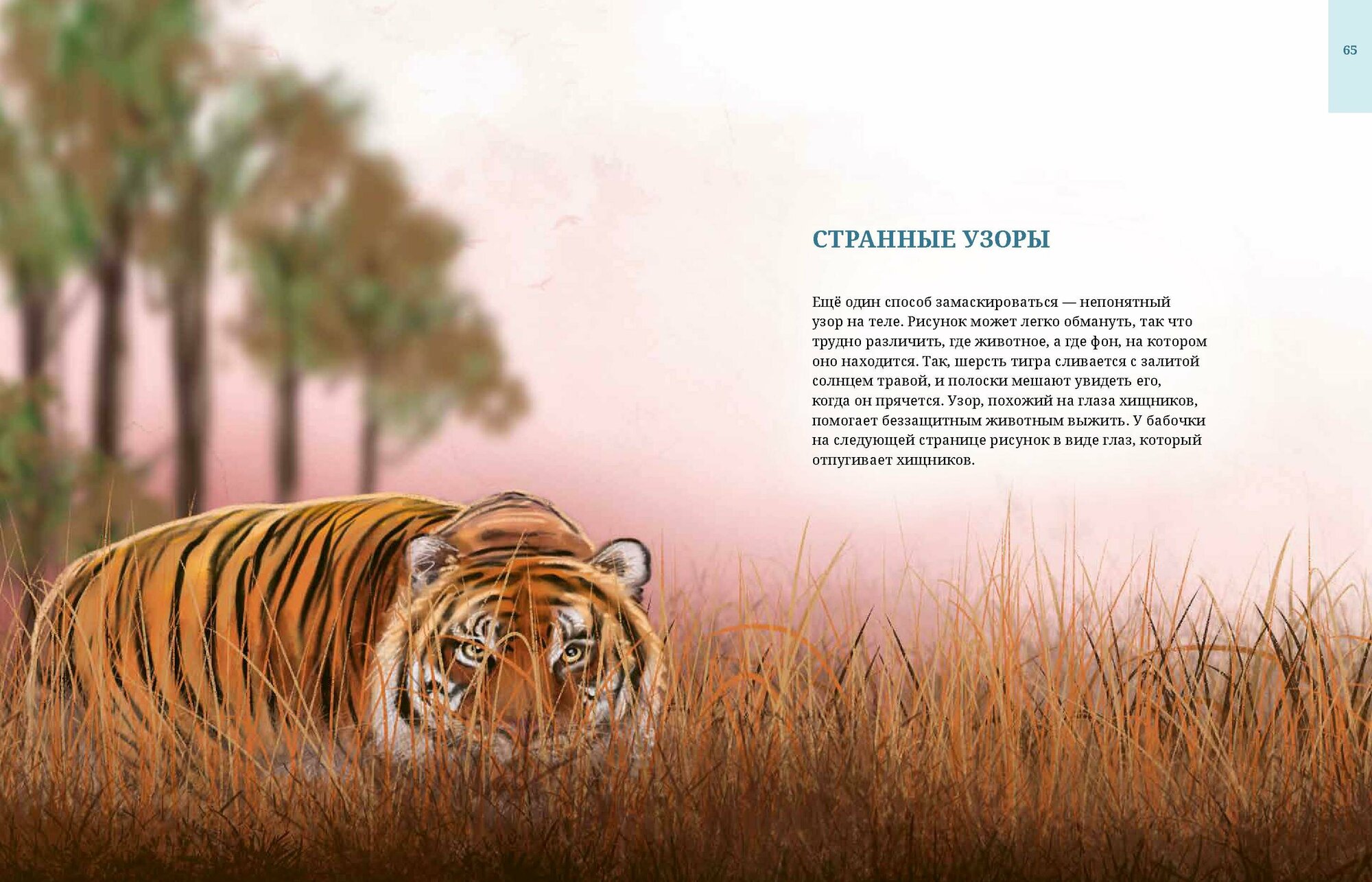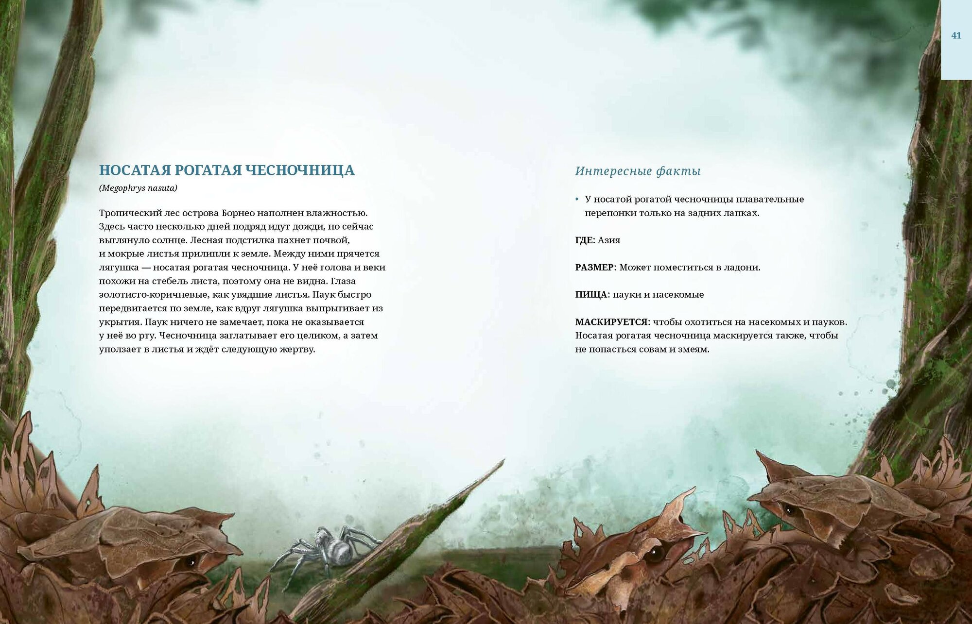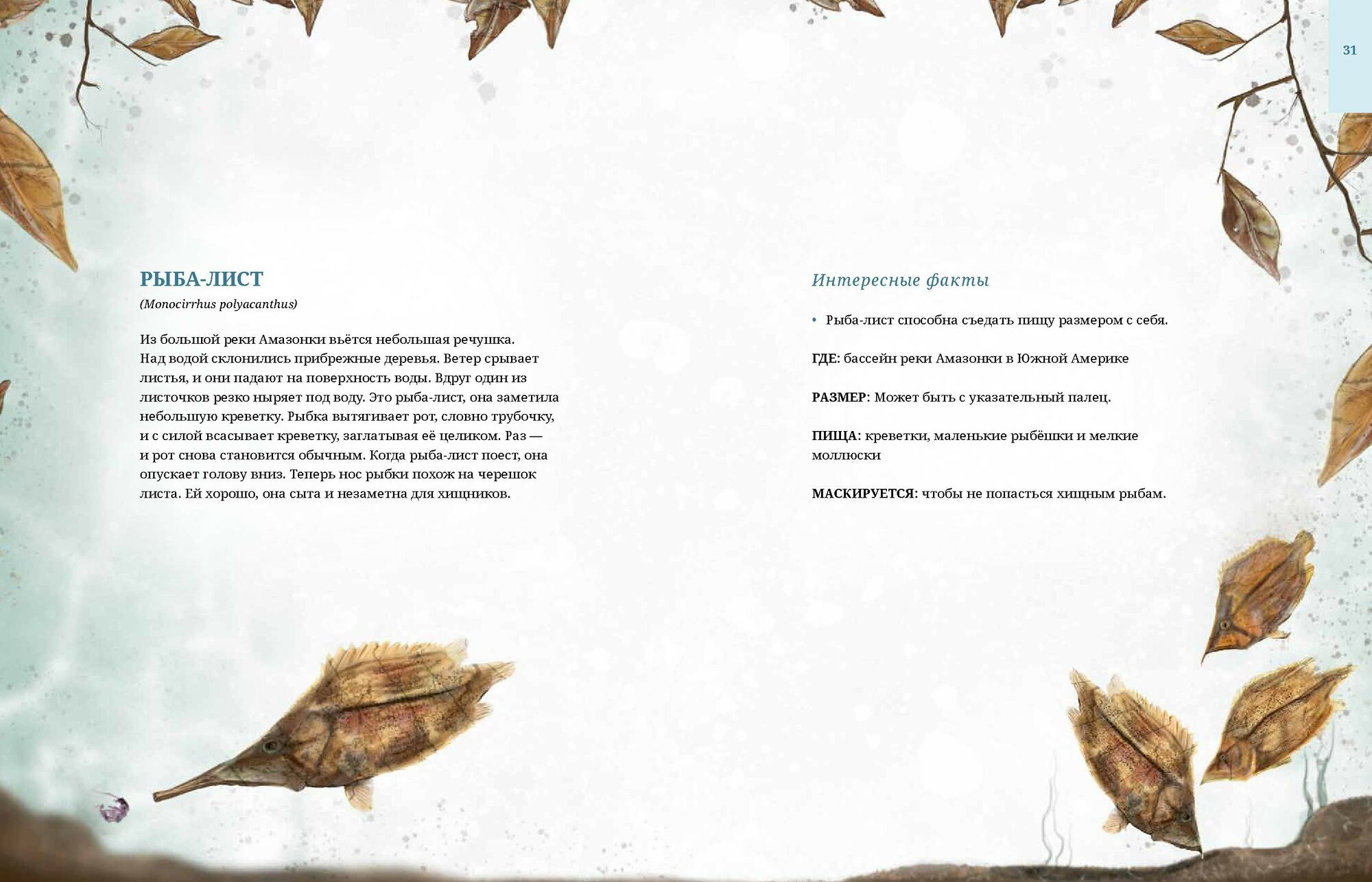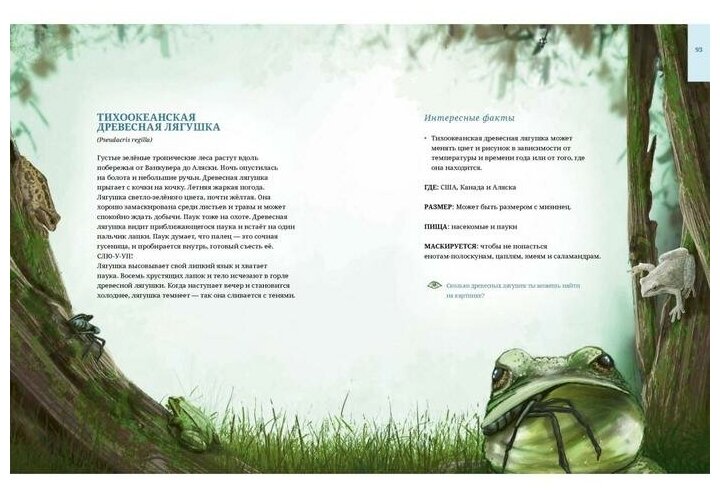 Красивая познавательная книга, мы приобрели все 3 ("синий кит," "под арктическим льдом" , и все они замечательные). На каждом развороте представлено животное и интересные факты о нем. Чем питается, для чего маскируется и где обитает. Написано доступно и интересно. Описано Много редких и неизвестных представителей. Например пауки меня поразили, если про паука, притворяющегося ?? муравьём я знала, то некоторые очень удивили своими способностями:один цвет меняет, становится белым или жёлтым, в зависимости от цветка на котором находится, а у другого спина- вылитая божья коровка! Тут и насекомые, и птицы, и рыбы. Иллюстрации- это отдельный восторг! И ещё в этой книге есть задания на внимательность, нужно найти всех замаскировавшихся животных(ответы есть в конце книги)