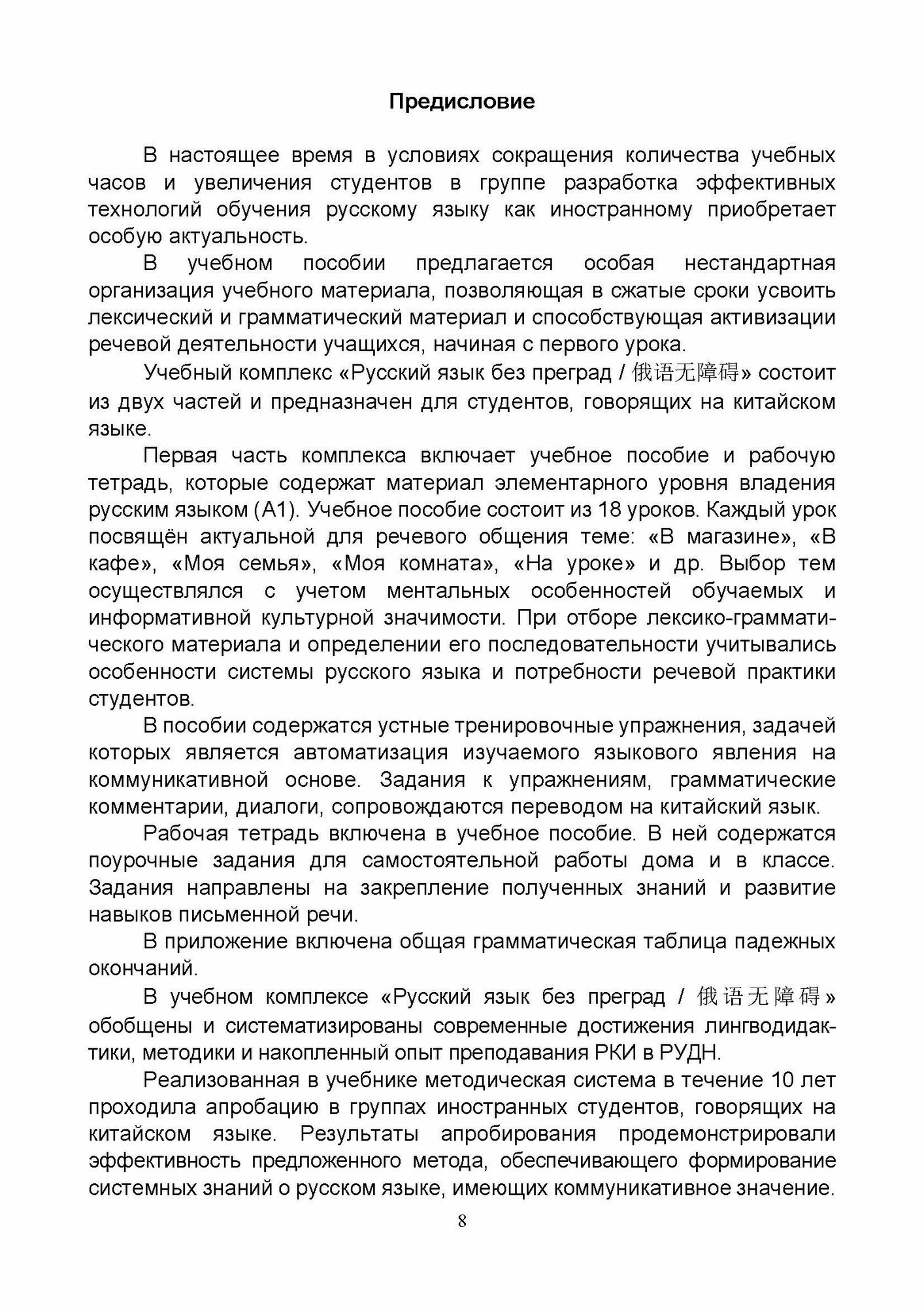 Учебный комплекс "Русский язык без преград" включает учебное пособие и рабочую тетрадь, содержащие материал элементарного уровня владения русским языком как иностранным (А1). В учебном пособии особая нестандартная организация учебного материала, позволяющая в сжатые сроки усвоить лексический и грамматический материал и способствующая активизации речевой деятельности учащихся. В пособии реализованы современные подходы к обучению русскому языку иностранцев: интенсивность, коммуникативность, практическая направленность и учёт родного языка. Грамматические комментарии, диалоги, упражнения сопровождаются переводом на китайский язык. По пособию можно работать как с преподавателем, так и самостоятельно.