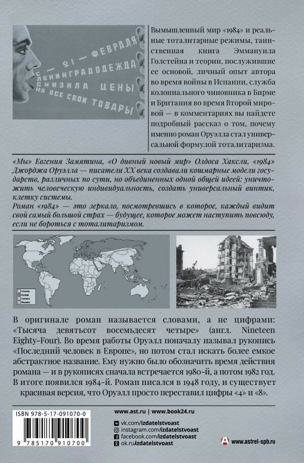 "Мы" Евгения Замятина, "О дивный новый мир" Олдоса Хаксли, "1984" Джорджа Оруэлла - писатели XX века создавали кошмарные модели государств, различных по сути, но объединенных одной общей идеей: уничтожить человеческую индивидуальность, создать универсальный винтик, клетку системы. Роман "1984" - это зеркало, посмотревшись в которое, каждый видит свой самый большой страх - будущее, которое может наступить повсюду, если не бороться с тоталитаризмом; настоящее, реалии которого мы не желаем признать; прошлое, которое не желает нас отпустить.