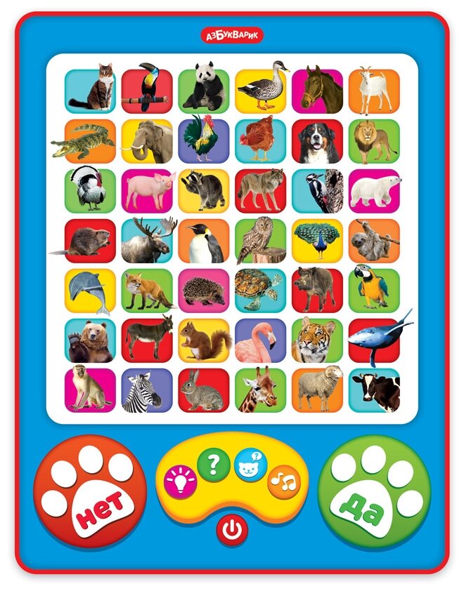 С новым говорящим планшетиком скучать не придётся! Он знает всех зверят! Загадай любое животное на картинке – умный планшетик отгадает, кто это! Как же он это сделает? Будет задавать вопросы, а ты отвечай – ДА или НЕТ и нажимай на кнопочки!