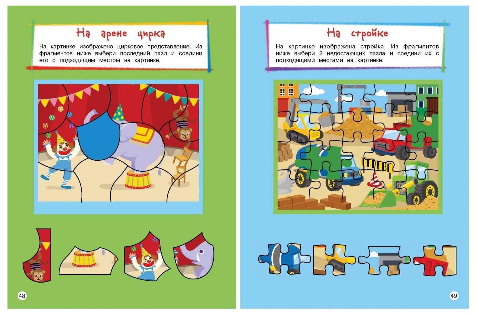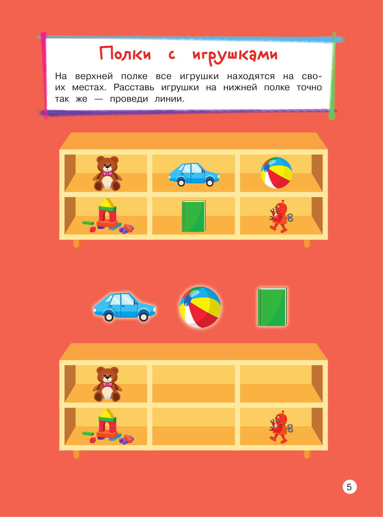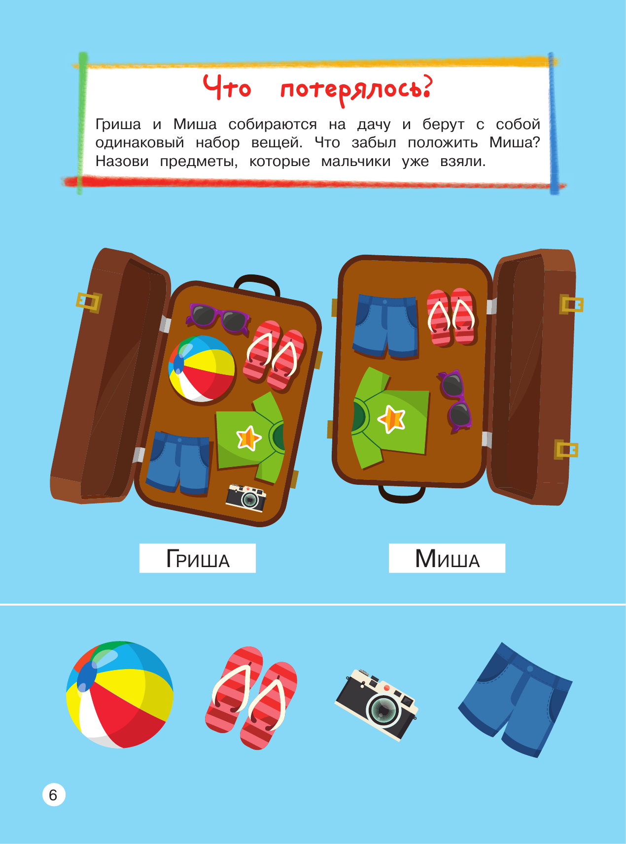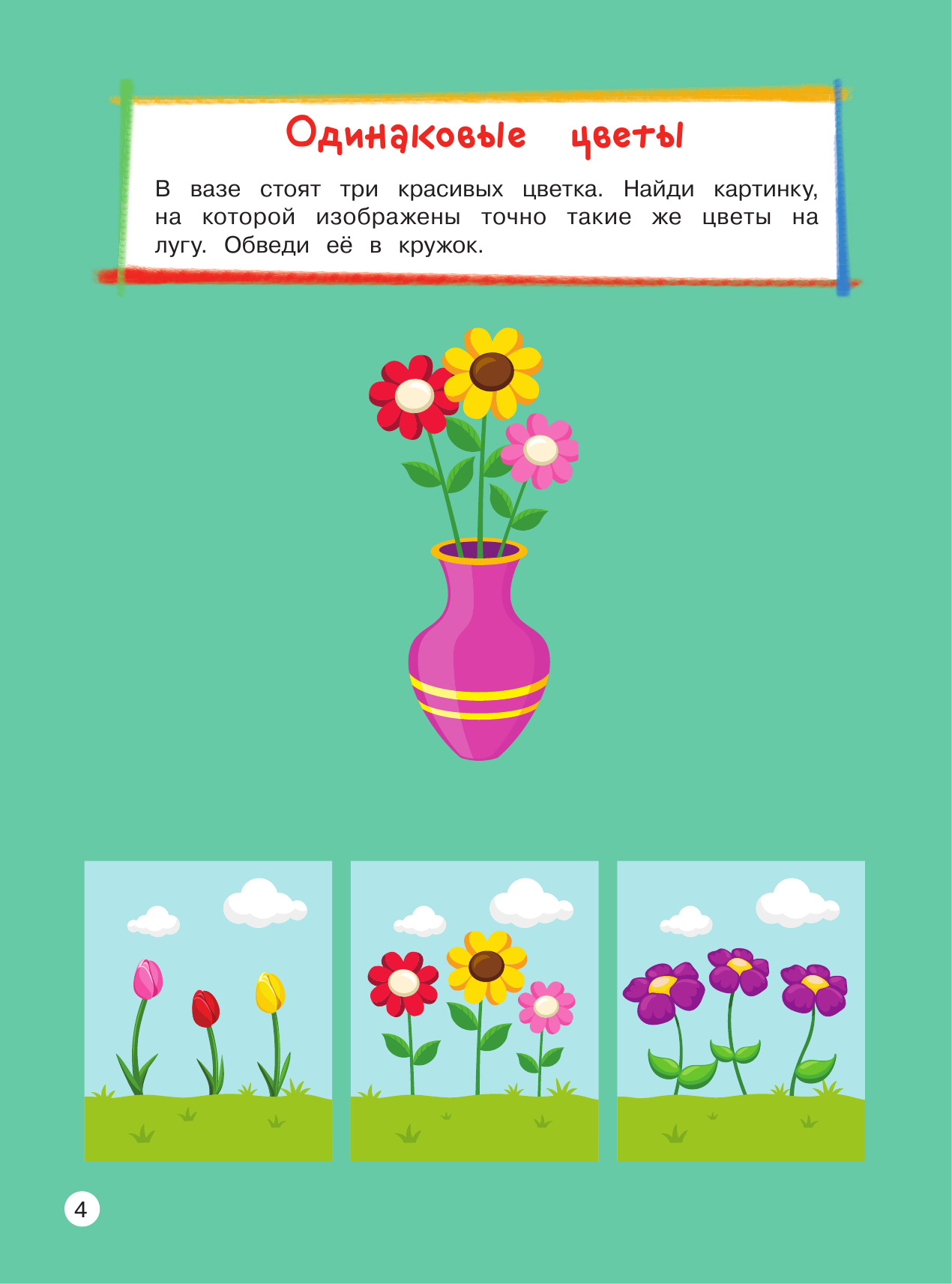 Выполняя увлекательные развивающие задания, ребёнок будет искать такие же картинки, как на образце, поможет Мише и Грише собрать чемоданы; найдёт портрет, который написал художник; повторит цвета радуги; найдёт флаг по указанным признакам; попытается определить животных по их следам; сможет объединить предметы в логические пары; поиграет в домино; соберёт картинку из пазлов; попробует решить, как правильно поступить в различных жизненных ситуациях и т. д. Современные добрые картинки повысят интерес ребёнка к занятиям, а доступность заданий придаст ребёнку уверенность в себе.