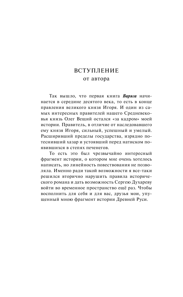 Мир, где главные дороги – речные и морские пути. За право контролировать их сражаются царства и империи. А еще – небольшие, но воинственные варяжские княжества, поставившие свои города на берегах рек, мимо которых не пройти ни к Дону, ни к Волге. И чтобы удержать свои земли, не дать врагам подмять под себя, разрушить, уничтожить, нужен был вождь, способный объединить и возглавить совсем юный союз варяжских князей и показать всем: хазарам, скандинавам, византийцам, печенегам: в мир пришла новая сила, с которую следует уважать.
