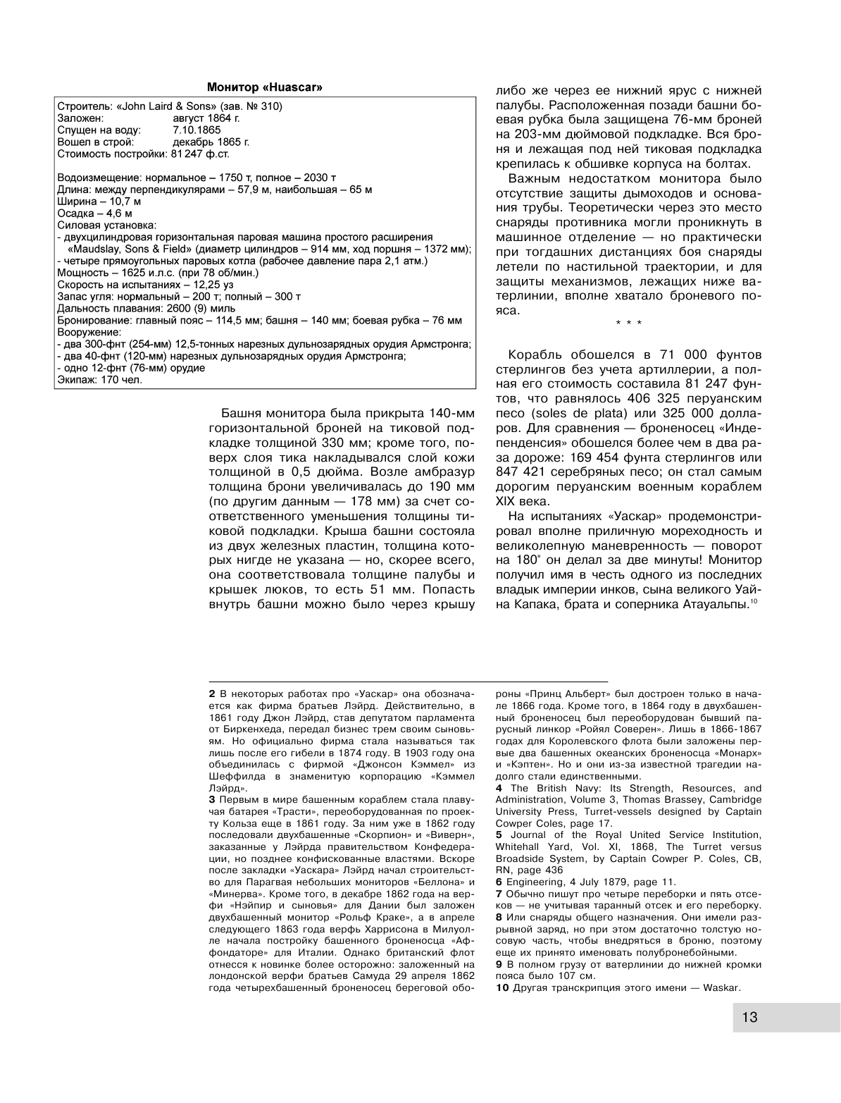 История знает не так много кораблей, которые смогли серьезно повлиять на эволюцию мирового военного кораблестроения. Одним из них стал монитор (низкобортный броненосец) "Уаскар" (Huascar), построенный в 1866 г. в Англии для Перу и позднее в неравном бою захваченный чилийцами. Этот небольшой корабль, названный в честь императора инков воевавшего против конкистадоров, совершенно не предназначенный для крейсерских операций, стал одним из самых успешных рейдеров в истории парового флота, заметно повлияв на эволюцию всего класса крейсеров. Кроме того, "Уаскар" - первый корабль против которого было применено торпедное оружие. Это произошло во время сражения в бухте Пакоча 29 мая 1877 г., когда противниками перуанского флагмана оказались британские фрегат "Шах" и корвет "Аметист". Монитор смог благополучно уклониться от торпеды Уайтхеда, а незадолго до этого боя тараном потопил корвет ВМС Чили. Под флагом бывшего врага "Уаскар" успешно участвовал во Второй Тихоокеанской войне (1879-1883), действия "чилийца" даже оказали серьезное влияние на политическую ситуацию в нескольких странах Латинской Америки. Сейчас "Уаскар" один из двух сохранившихся до наших дней кораблей середины XIX в.