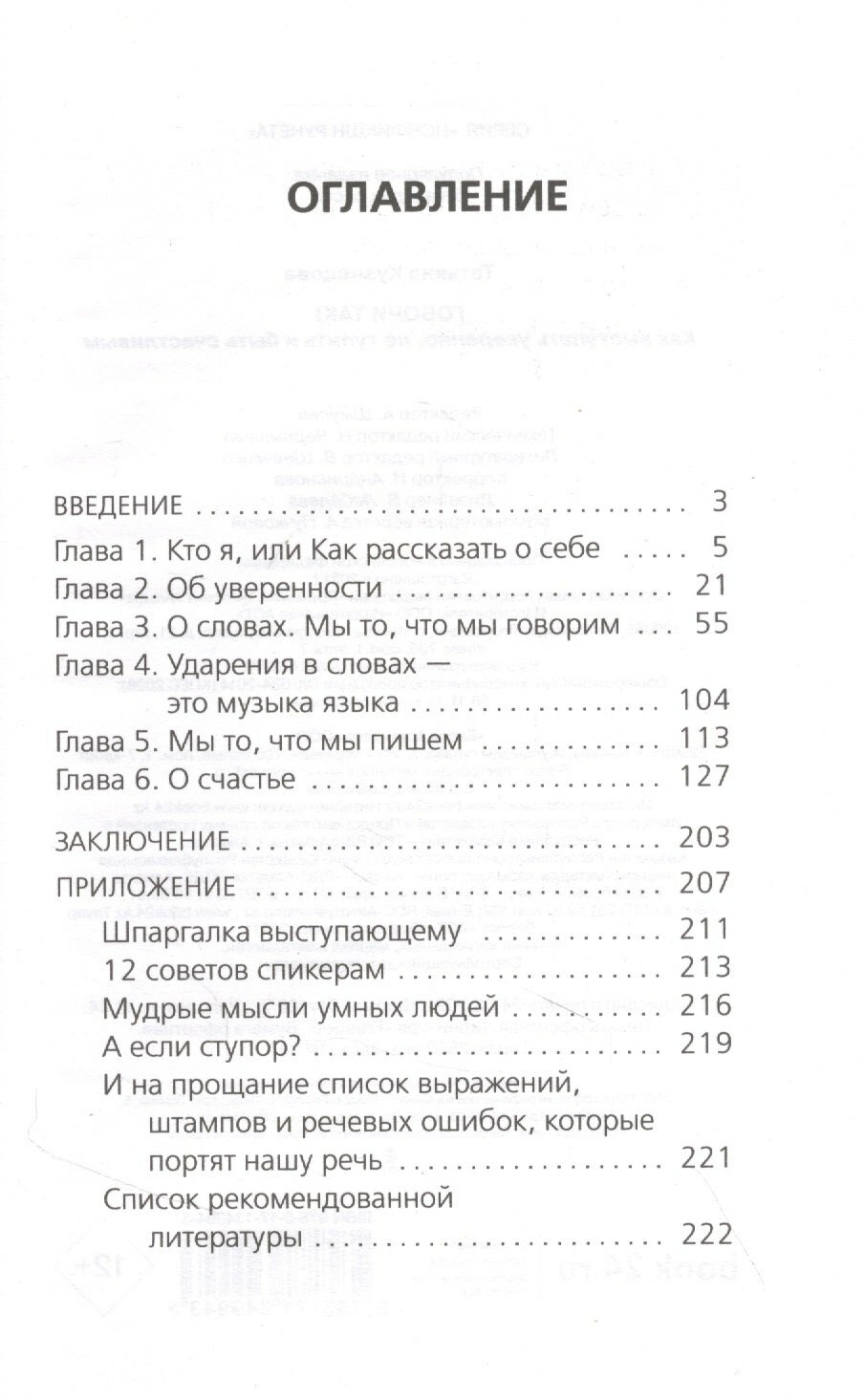 Поняла, что эта книга поможет мне уверенней говорить, а значит и стать более уверенной. В некоторых моментах согласна с автором на все 100%. Часто прочитанное вызывало улыбку и даже смех. Для себя взяла несколько советов автора и теперь буду избавляться от слов-паразитов. Для меня это отличный результат. При этом было не нудно и скучно, а интересно и весело. В конце даны приложения: словарь "100 слов с трудным ударением", шпаргалка выступающему (как успокоиться и настроиться на выступление за 15 минут до него) и т.д. Книга в переплёте. Бумага белая, чуть просвечивает. Текст комфортный для чтения.