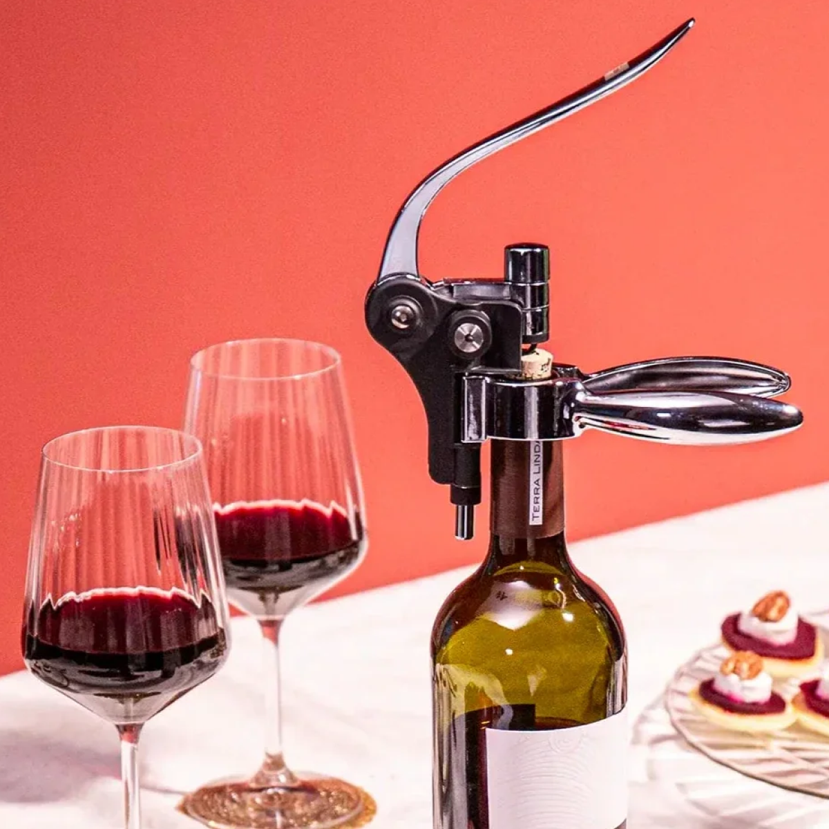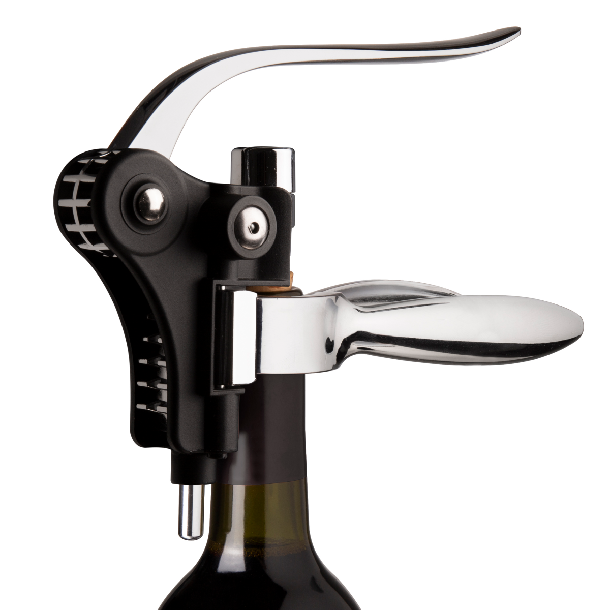 Рычажный горизонтальный штопор – замечательный способ справиться с открыванием бутылок. После удаления фольги, поместите штопор сверху бутылки и прижмите ручки, чтобы удержать ее на месте. Просто потяните ручку вниз, чтобы вставить спираль в пробку, и вверх, чтобы извлечь.