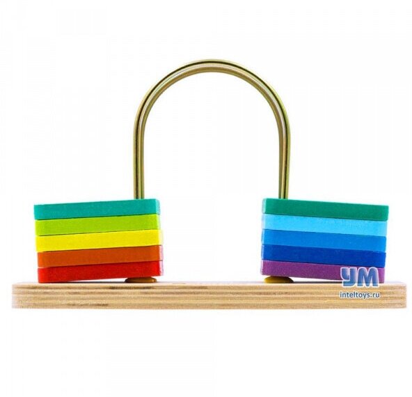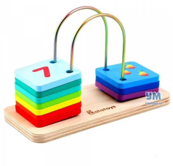 Игровой деревянный набор для обучения счету с деревянным основанием с 2-мя металлическими дугами, на которых можно перемещать счетный материал – 11 деталей прямоугольной формы с цифрами на одной стороне и картинкой такого же количества предметов.