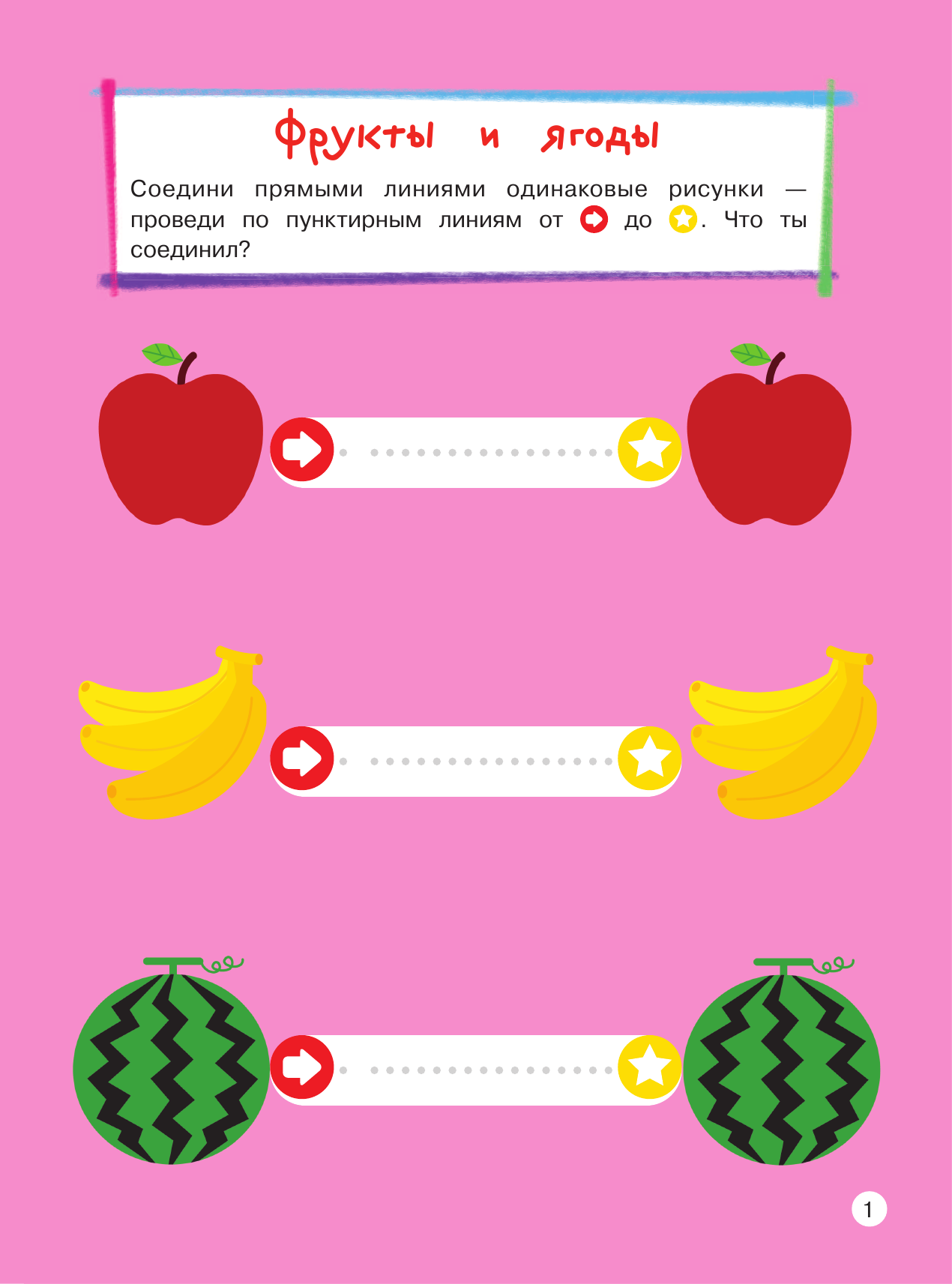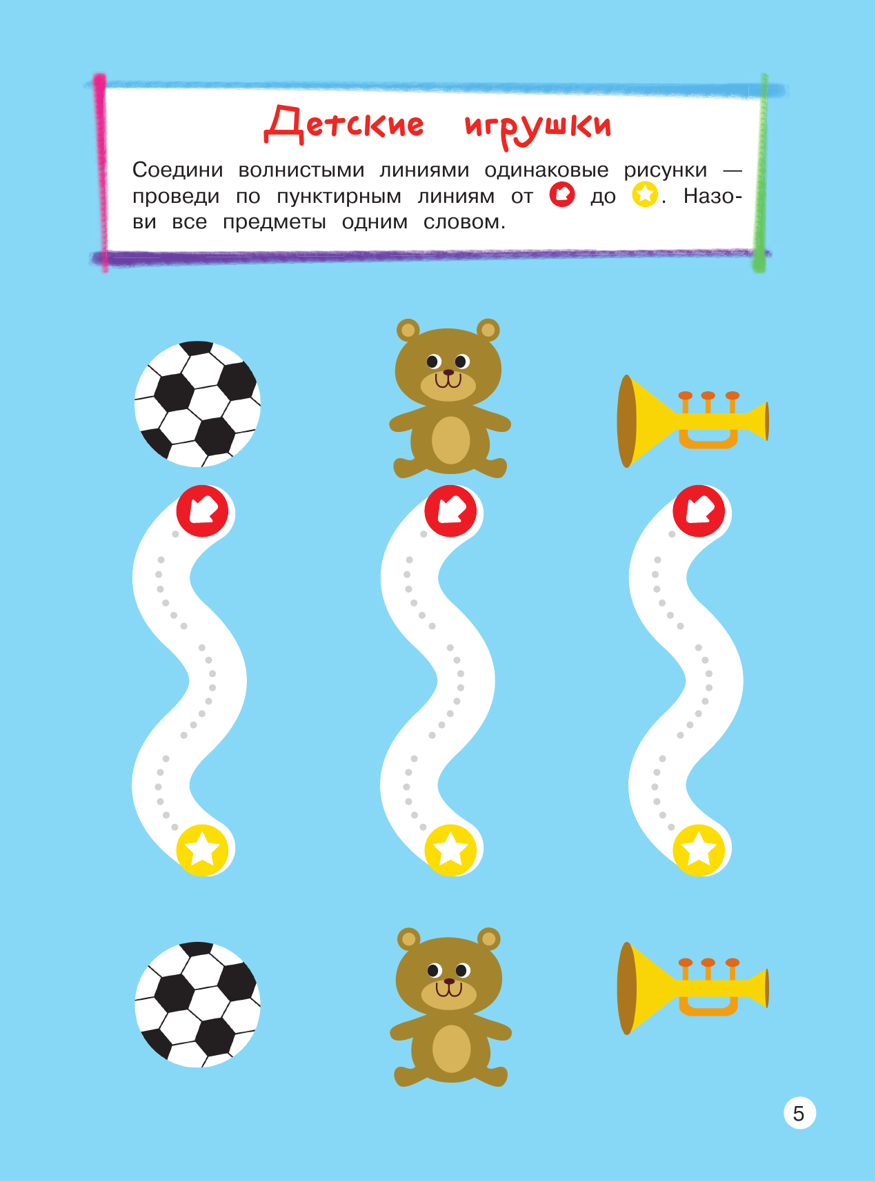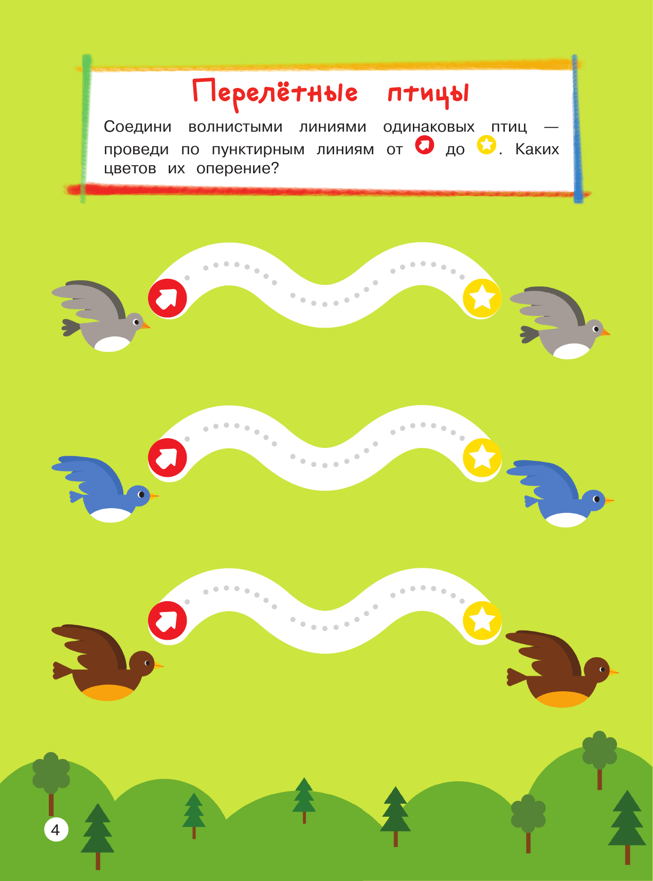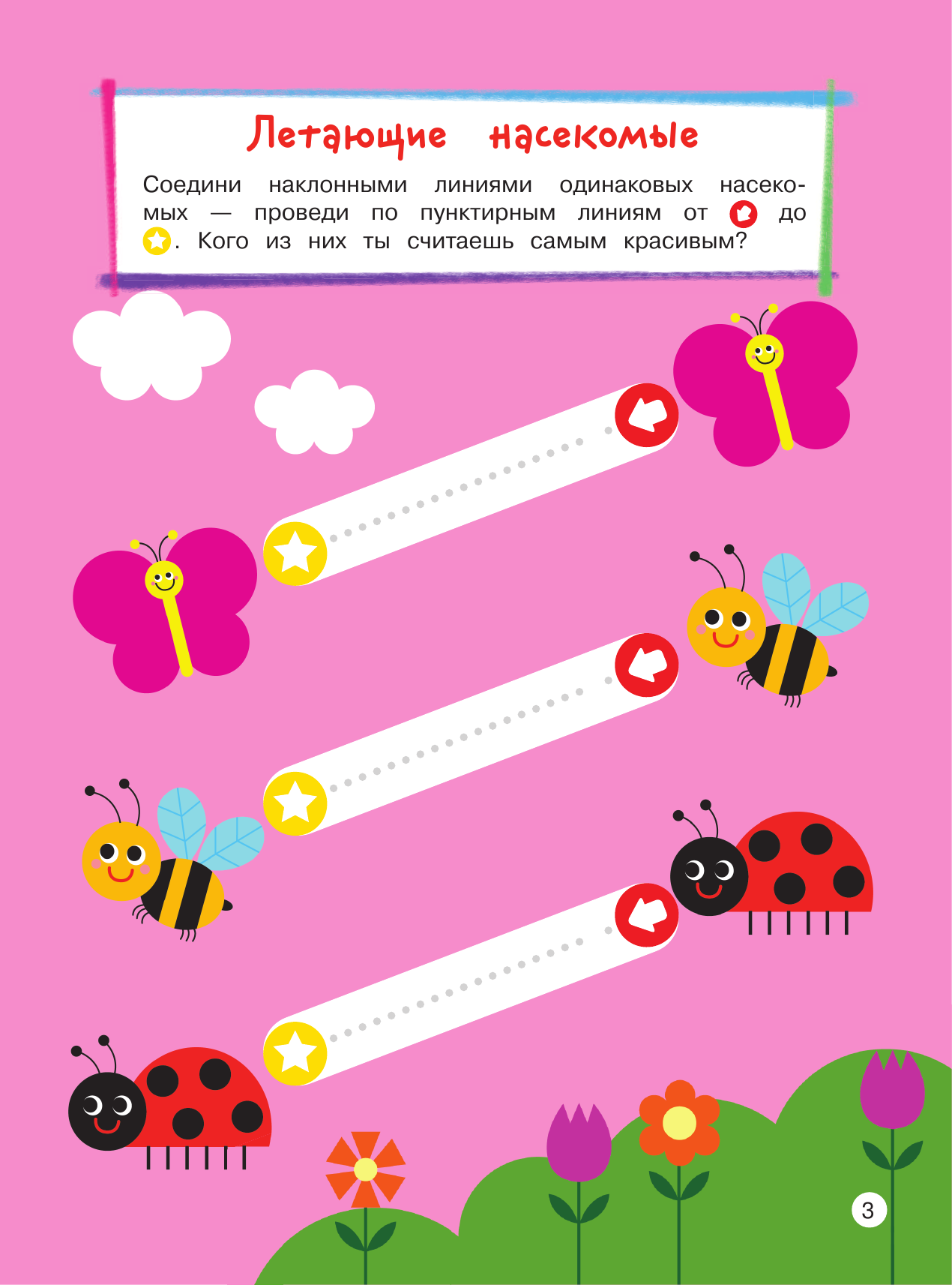 Выполняя интересные занимательные задания, малыш познакомиться с разными типами линий и цифрами от 1 до 5; научится соотносить число с количеством пальчиков и предметов; отработает понятия больше — меньше; поиграет в прятки с цифрами; поможет белкам сделать запасы на зиму; угостит обезьян бананами, будет запускать воздушных змеев вместе с ребятами, попробует пройти простейшие лабиринты, аккуратно раскрасить картинки и т. д. Замечательные добрые картинки повысят интерес ребенка к занятиям, а доступность заданий придаст уверенности в себе.