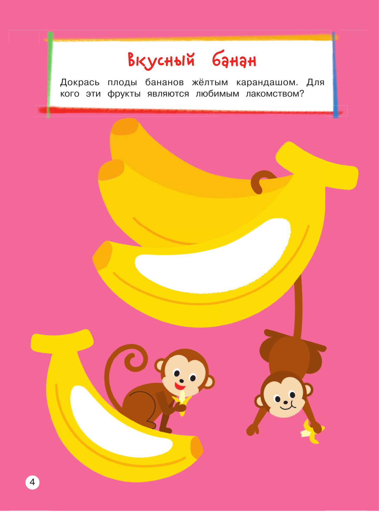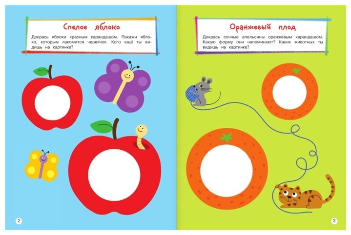 Выполняя интересные занимательные задания, малыш будет докрашивать фрукты, овощи, ягоды; раскрашивать животных, птиц, рыб, разные виды транспорта и различные предметы по образцу; дорисовывать колючки у кактуса, лапки у паука, зубы у крокодила; выбирать праздничный торт и мороженое из меню; повторит формы и просто весело проведёт время. Замечательные добрые картинки повысят интерес ребенка к занятиям, а доступность заданий придаст уверенности в себе.