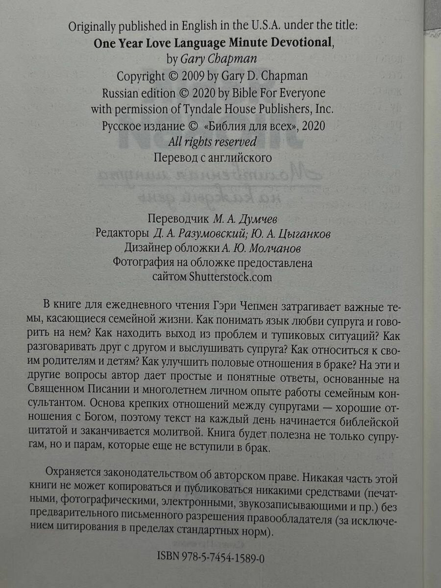 В книге для ежедневного чтения Гэри Чепмен затрагивает важные темы, касающиеся семейной жизни. Как понимать язык любви супруга и говорить на нем? Как находить выход из проблем и тупиковых ситуаций? Как разговаривать друг с другом и выслушивать супруга? Как относиться к своим родителям и детям? Как улучшить половые отношения в браке? На эти и другие вопросы автор дает простые и понятные ответы, основанные на Священном Писании и многолетнем личном опыте работы семейным консультантом. Основа крепких отношений между супругами — хорошие отношения с Богом, поэтому текст на каждый день начинается библейской цитатой и заканчивается молитвой.