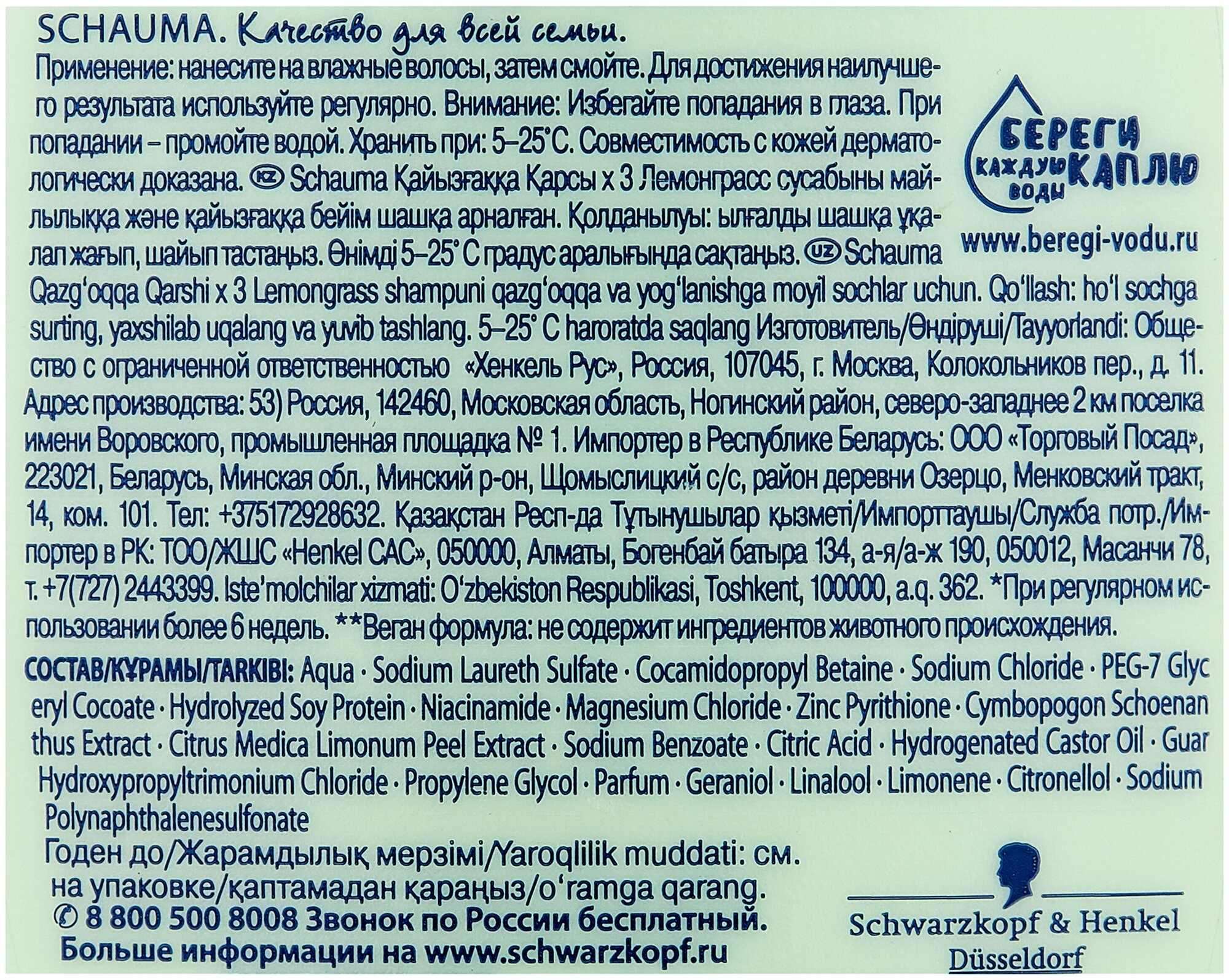 - Шампунь SCHAUMA Лемонграсс Для склонных к жирности и перхоти волос 380 мл Видеоотзыв (обзор) Натальи
