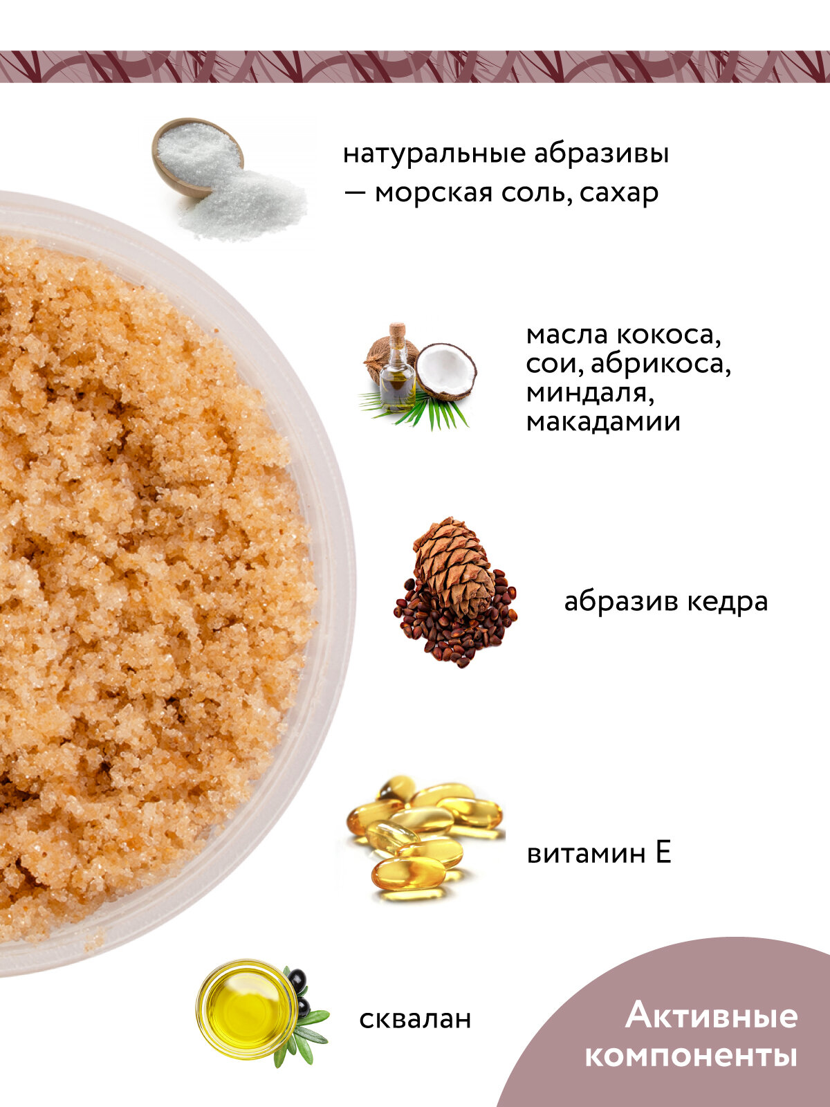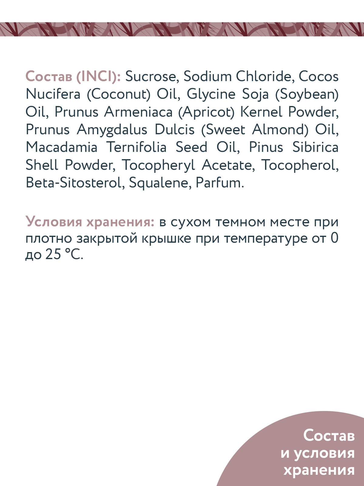 | Состав | sucrose, sodium chloride, cocos nucifera (coconut) oil, glycine soja (soybean) oil, prunus armeniaca (apricot) kernel powder, prunus amygdalus dulcis (sweet almond) oil, macadamia ternifolia seed oil, pinus sibirica shell powder, tocopheryl acetate, tocopherol, beta-sitosterol, squalene, parfum |