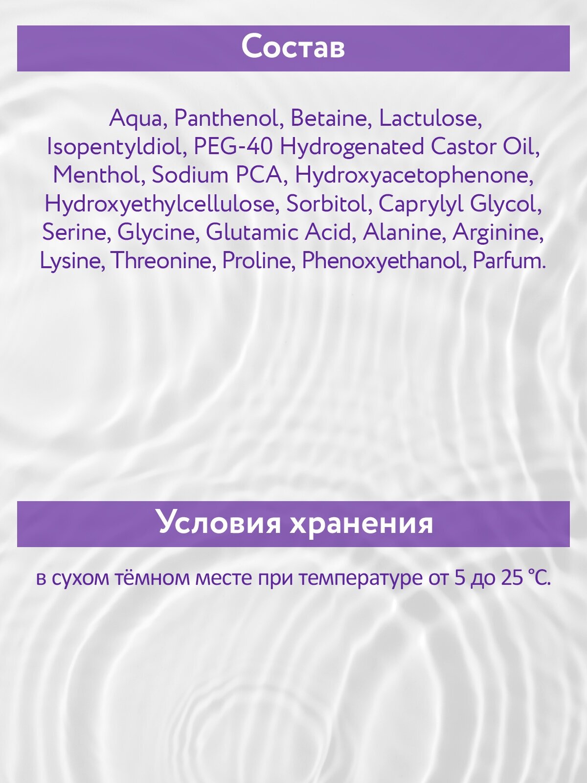 | Состав | aqua, panthenol, betaine, lactulose, isopentyldiol, peg-40 hydrogenated castor oil, menthol, sodium pca, hydroxyacetophenone, hydroxyethylcellulose, sorbitol, caprylyl glycol, serine, glycine, glutamic acid, alanine, arginine, lysine, threonine, proline, phenoxyethanol, parfum |