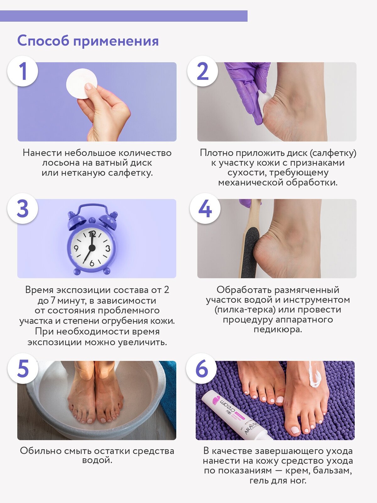 Нанести небольшое количество лосьона на ватный диск или кусок нетканной салфетки. Плотно приложить салфетку (диск) к участку кожи, требующему механической обработки, с признаками сухости. Время экспозиции состава от 2 до 7 минут, в зависимости от состояния проблемного участка и степени огрубения кожи. При необходимости время экспозиции может быть увеличено. Обработать размягченный участок водой и инструментом (пилка-терка). Обильно смыть остатки средства водой. Нанести на кожу средство ухода по показаниям - крем, бальзам, гель для ног.