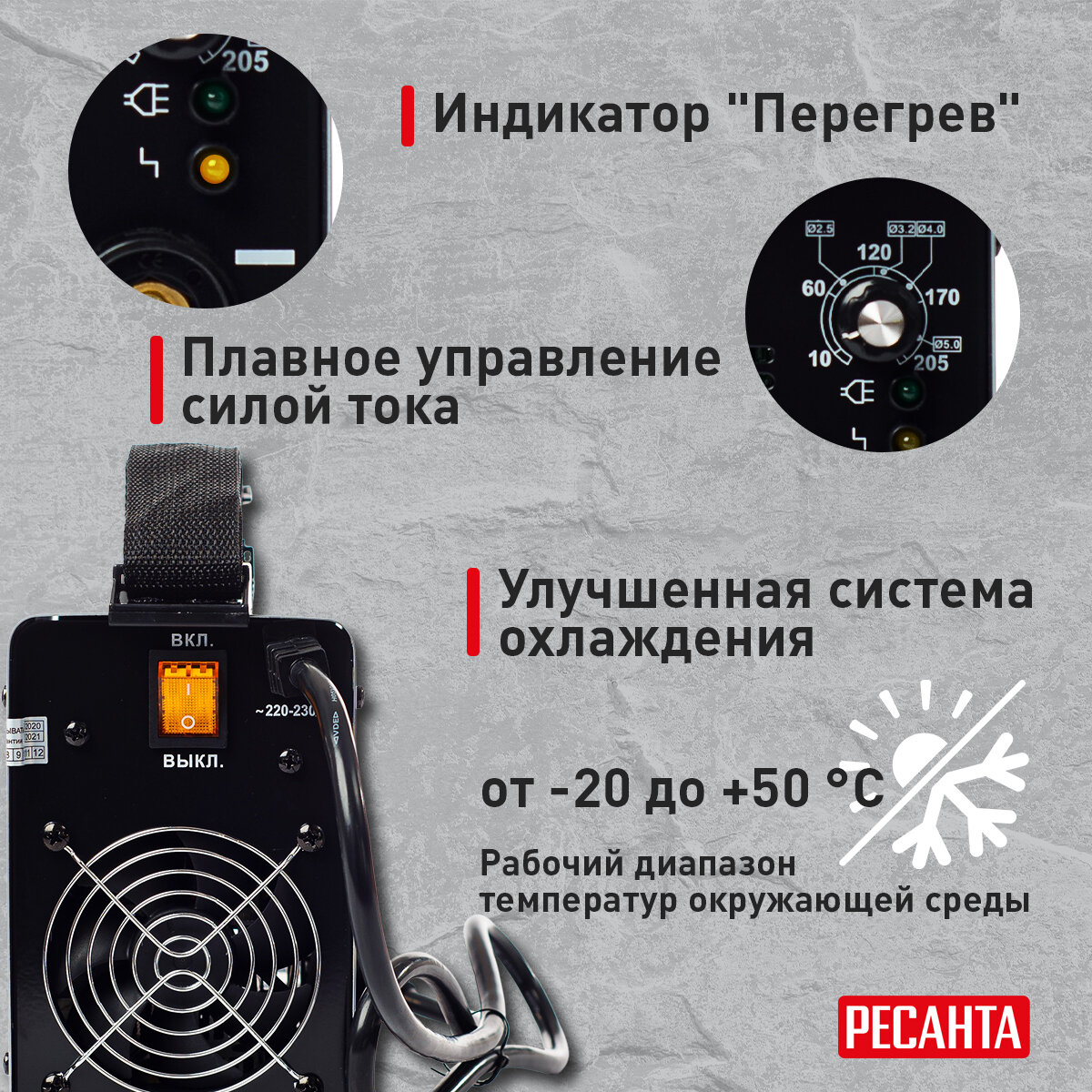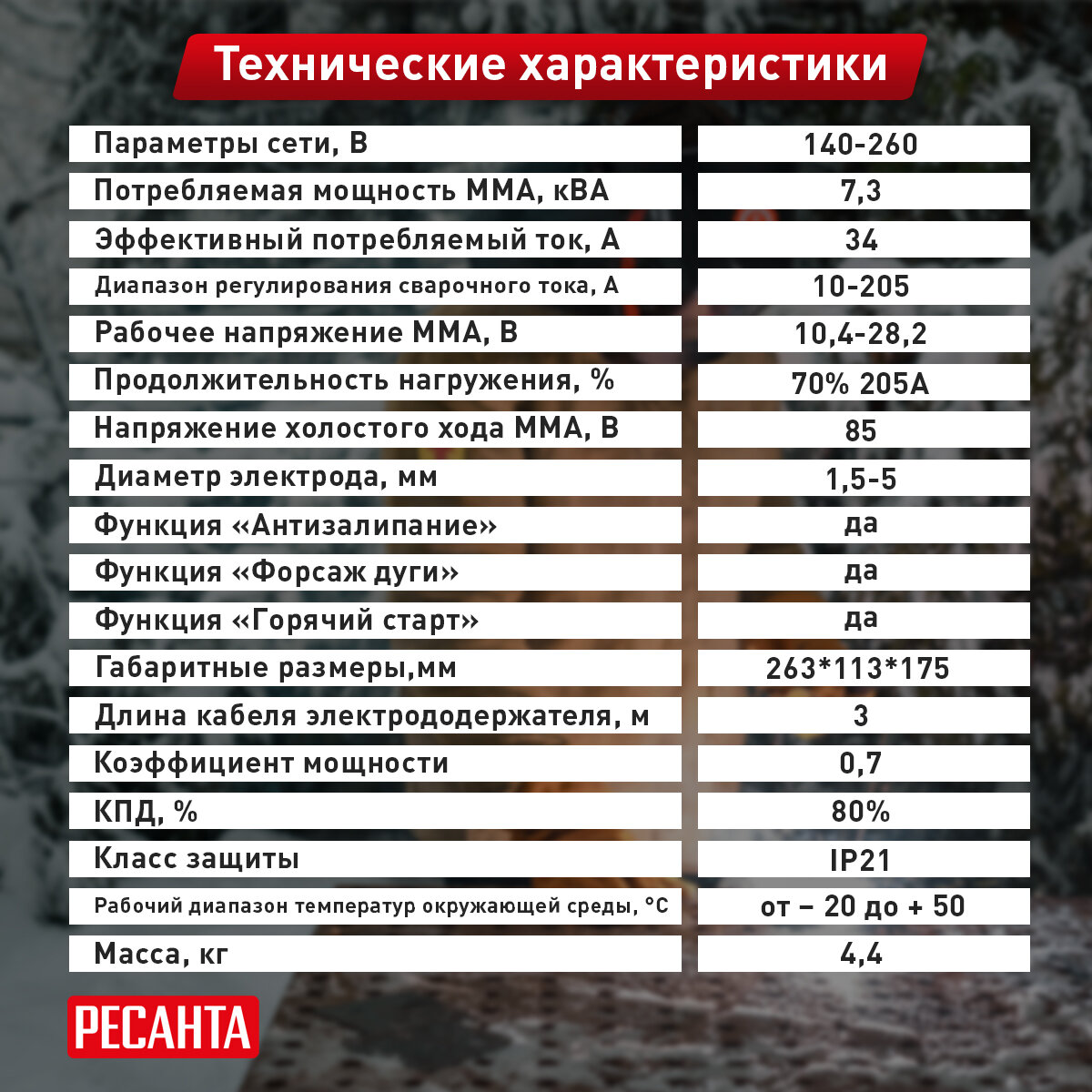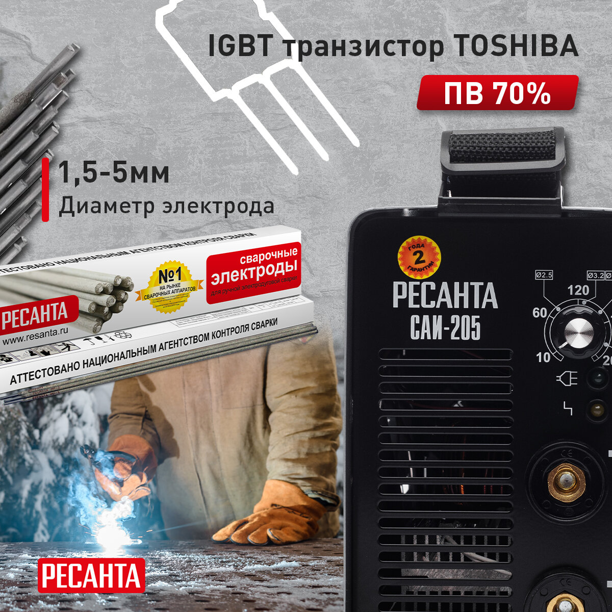 САИ-205 Ресанта - предназначены для ручной дуговой сварки штучным покрытым электродом на постоянном токе и электродом с рутиловым и основным покрытием (режим ММА).Данная серия сварочных аппаратов разработана на базе IGBT транзисторов TOSHIBA.