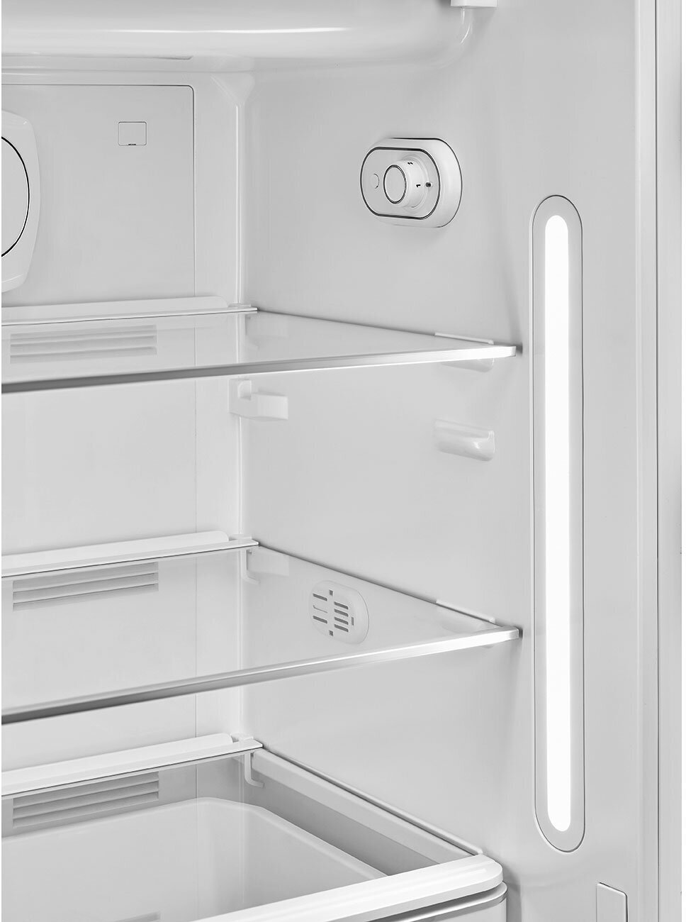 Отдельностоящий холодильник оснащен удобным интерфейсом с точным электронным контролем температуры. Просторное холодильное отделение (244 литра) укомплектовано большим количеством полок, ящиков и подставок для размещения продуктов. В верхней части устройства есть компактная морозильная камера объемом 26 литров. Мощность замораживания еды составляет 2 кг/сутки. Зона свежести обеспечивает идеальный микроклимат для мяса, рыбы, овощей, фруктов, грибов и зелени. Модель в стиле ретро поможет создать на кухне теплую и уютную атмосферу середины 20-го века.