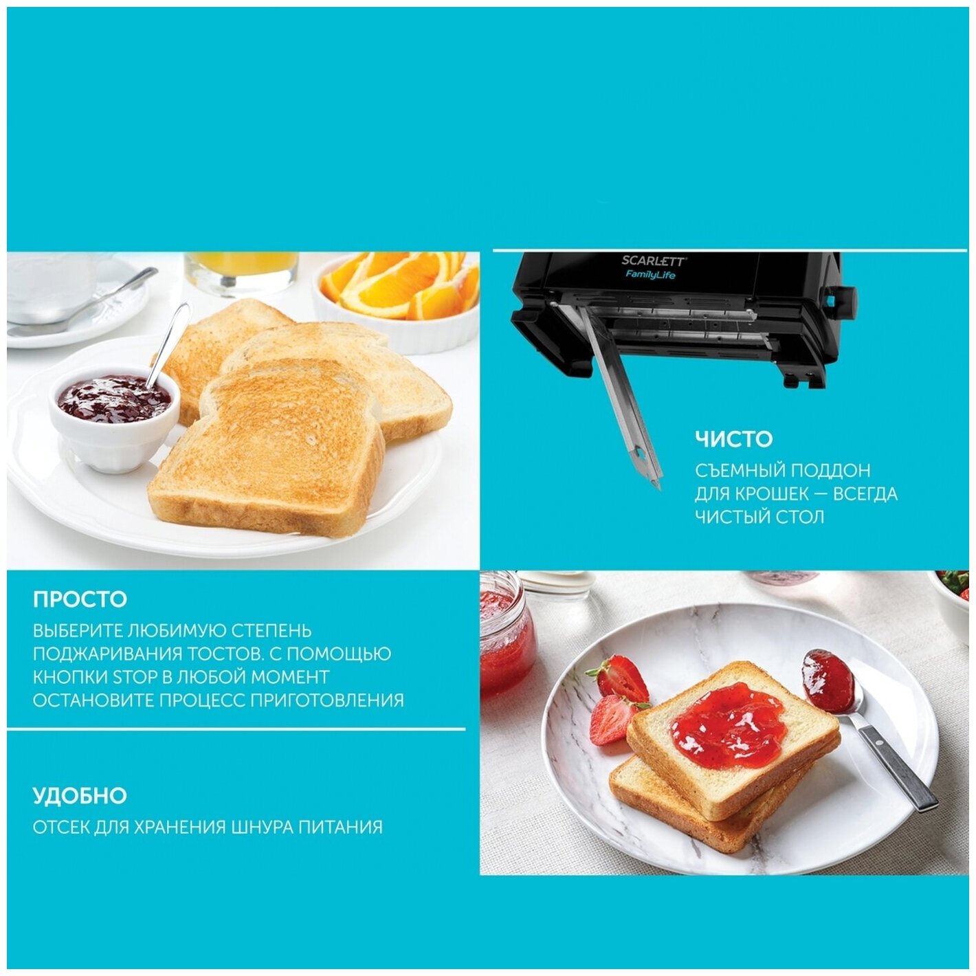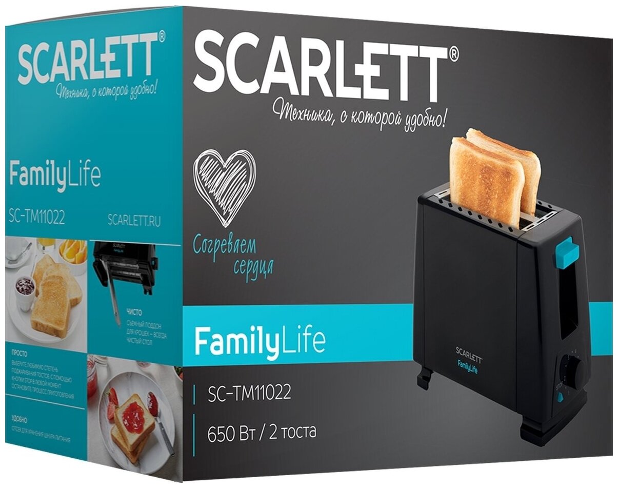 | Прочие особенности и свойства | Компактный и стильный тостер SC-TM11022 мощностью 650 Вт с 6 степенями поджаривания будет радовать Вас вкусными завтраками каждый день! Система хранения шнура сэкономит место на Вашей кухне, а выдвижной поддон для крошек сохранит стол чистым. Корпус тостера SC-TM11022 изготовлен изнержавеющей стали и качественного пластика, а классическое черно-голубое цветовое сочетание идеально впишется в интерьер Вашей кухни! |