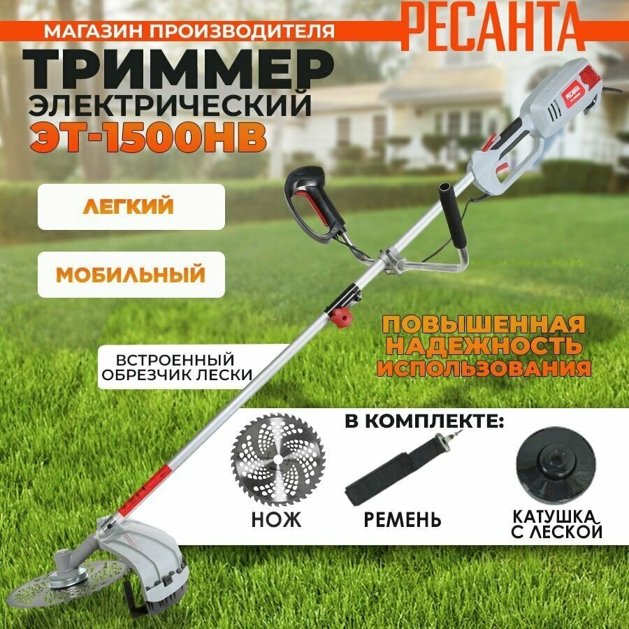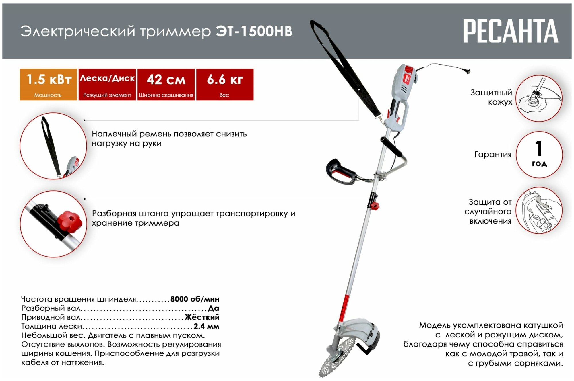 Триммер электрический Ресанта ЭТ-1500НВ - малошумный и мощный инструмент предназначен для кошения травы, а также для уборки сухостоя и густых зарослей. Электродвигатель с воздушным охлаждением имеет мощность 2,04 л.с. или 1,5 кВт. Велосипедная ручка делает работу более удобной. Разъемная штанга экономит место во время хранения и упрощает транспортировку триммера.