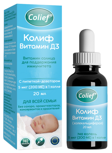 Витамин Д3 в каплях для детей Ирландского бренда Колиф (Colief) - гипоаллергенный витамин D3 из ланолина овечьей шерсти для детей с рождения (200МЕ в одной капле) в кокосовом масле.Без ароматизаторов, красителей и консервантов.Не вызывает аллергию - в составе только Витамин Д3 и кокосовое масло из ланолина овечьей шерсти.Не содержит бензиловый спирт, эмульгаторы, ароматизаторы, консерванты и красители. Произведен по стандартам GMP в Венгрии.Органический витамин d3 выделен из ланолина овечьей шерсти (не синтезирован искусственно) поэтому не нарушена природная структура молекулы. Натуральное происхождение Д3 обуславливает естественное и полноценное усвоение организмом витамина Д3 в очищенном кокосовом масле.С очень удобной пипеткой.740 капель в 20 мл - хватит на 1 год при приеме профилактических доз