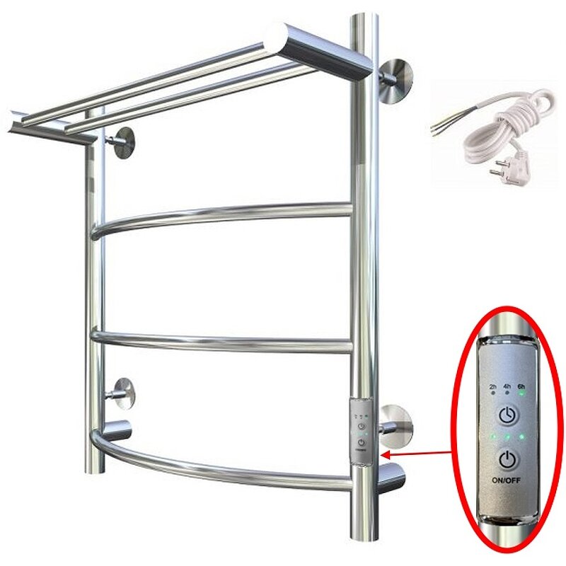 Изделие производится из нержавеющей стали AISI 201. Вертикальные трубы d -32 мм., для горизонтальных вставок используется труба d 18 мм. Нагревательным элементом в полотенцесушителе является греющий кабель аналог теплого пола, кабель заправляется внутрь каждой трубы и передает тепло на поверхность изделия. Во включенном состоянии постоянно поддерживается температура 50-600. Экономичность: Полотенцесушитель снабжен панелью управления. Кнопка включения/выключения и таймер на 2 часа и 4 часа , который позволяет включать изделие на ограниченное время. Эта функция дает возможность экономить электричество. Мощность электрического прибора порядка 60W при стоимости 1 кВт 5 руб несложно посчитать: 60W х 24 = 1,5 кВт в сутки. Стоимость эксплуатации изделия за сутки 1,5 кВт х 5 руб. = 7,5 руб. Максимальный расход электричества за месяц примерно 225 руб. При условии если сушка работает круглосуточно. Удобство монтажа: Полотенцесушитель крепится к стене на четыре держателя. Универсальное исполнение изделия позволяет подключить его, как справа, так и слева. Скрытое подключение: Благодаря приваренным в нижней части вертикальных труб двум распаячным коробкам, в которых соединяется электропроводка, возможно скрытое подключение к электричеству слева и справа. Подключение в розетку: В комплекте также имеется шнур с вилкой, который будет необходим при подключении к розетке.
