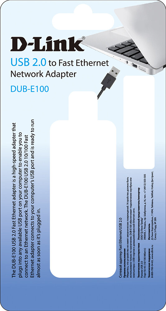 DUB-E100 USB 2.0 10/100 Fast Ethernet – это высокоскоростной адаптер, устанавливаемый в свободный USB-порт компьютера для подключения к сети Ethernet. DUB-E100 исключает необходимость использования компьютера для установки сетевого адаптера, а также позволяет оставлять свободным слот расширения для подключения других устройств.