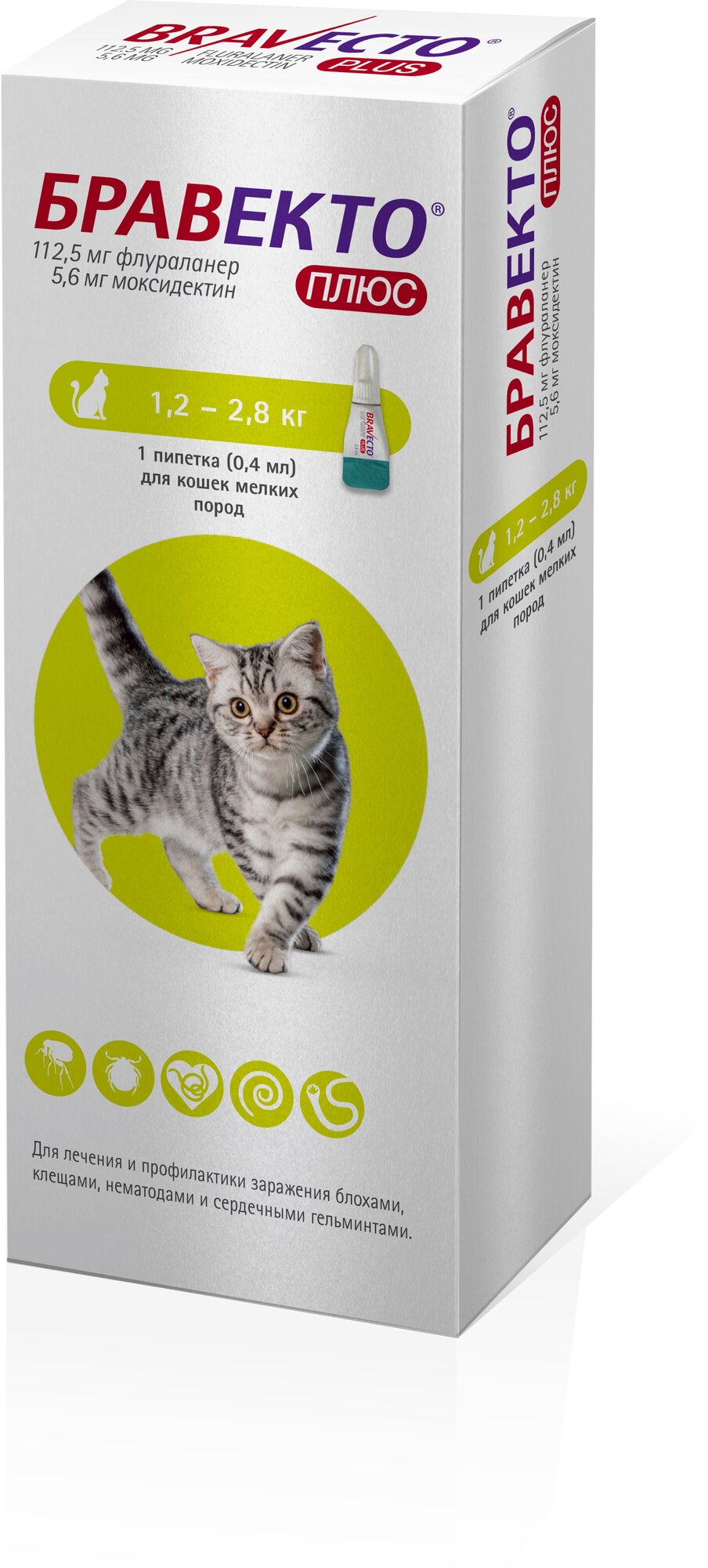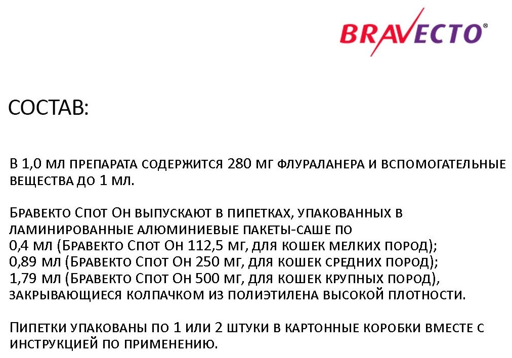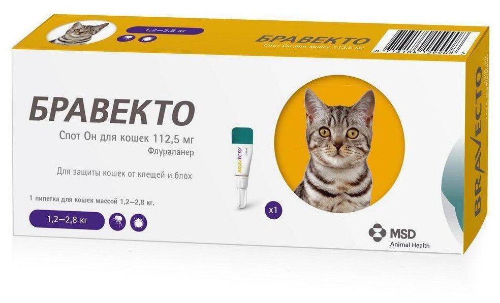 Описание Бравекто, Спот Он для кошек 1.2 - 2.8 кг, пипетка 112.5 мг:Данное средство применяют к кошкам и котятам, чтобы уберечь их от таких паразитов, как блохи и клещи, а также для уничтожения насекомых, которые уже находятся на коже животных. Главное действующее вещество - флураланер - действенный акарицид и инсектицид, что делает его надежным защитником вашего питомца от кровососущих паразитов.Наносят препарат на область у основания черепа, аккуратно сдавливая пипетку так, чтобы все содержимое оказалось непосредственно на коже. Тщательно следите за тем, чтобы во время нанесения спина кошки находилась в строго горизонтальном положении. Для этого лучше, чтобы питомец стоял или лежал.Всасываясь через кожный покров, флураланер быстро (за 8 часов) попадает в кровеносную систему, уничтожая таким образом кровососущих паразитов. Действие вещества сохраняется до 12 недель.Применяя препарат бравекто Спот ОН, каждый хозяин может быть уверен в том, что его питомец надежно защищен от клещей и блох, которые особенно активны в летний период.внимание! Приведенное описание препарата инструкцией не является.
