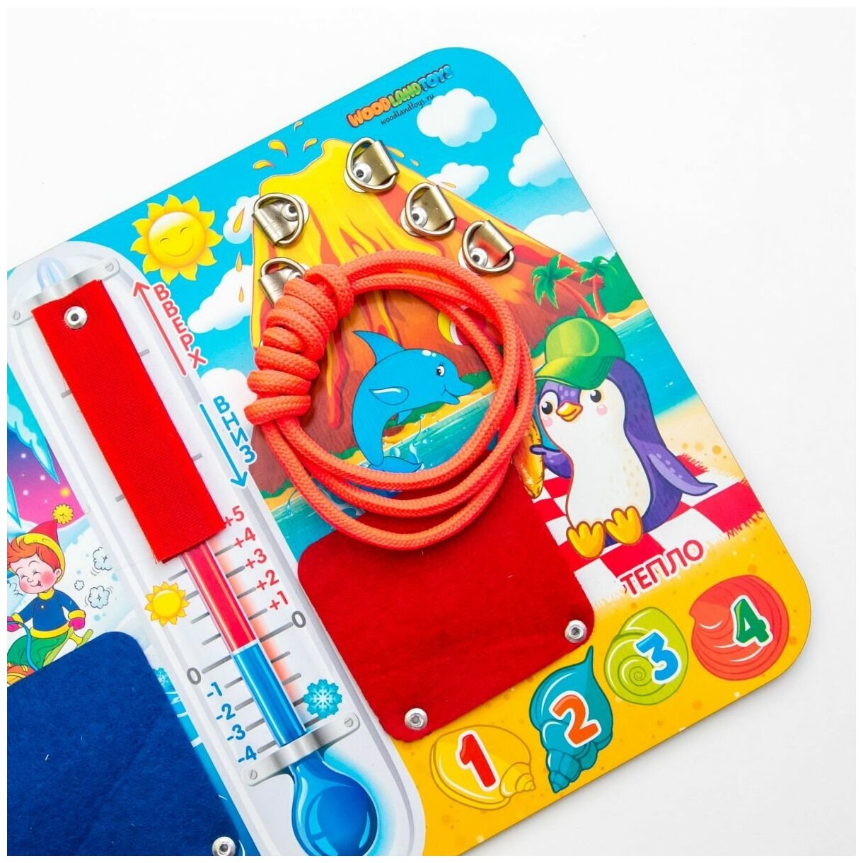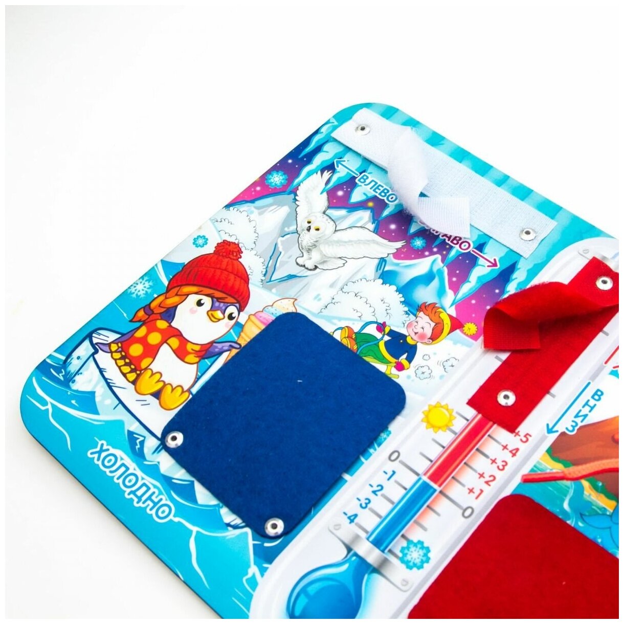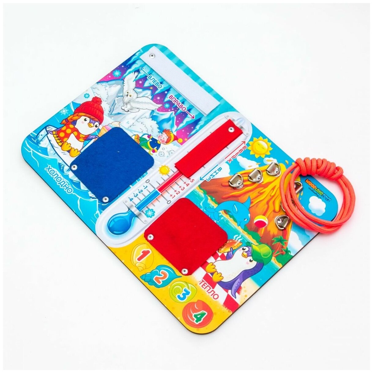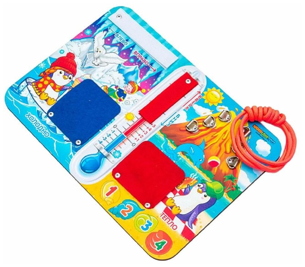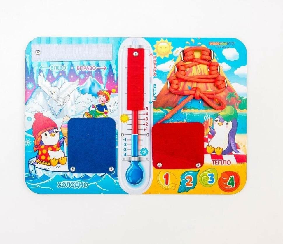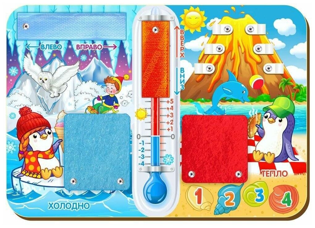 Бизиборд – это популярная многофункциональная развивающая игрушка. Бизиборд «Тепло-холодно» представляет собой деревянный планшет с тематическим изображением, на котором расположены фетровые шторки, липучки и шнуровка. С бизибордом «Тепло-холодно» можно совершить путешествие сразу на северный полюс и в южную страну и познакомится с принципом действия градусника. Игры и занятия с Бизибордом развивают мышление, память, воображение, стимулируют мелкую моторику и координацию движения. В процессе игры у ребенка формируются причинно-следственные связи, развивается самостоятельность и познавательная активность. Бизиборд займет ребенка на продолжительное время и принесет массу положительных эмоций.