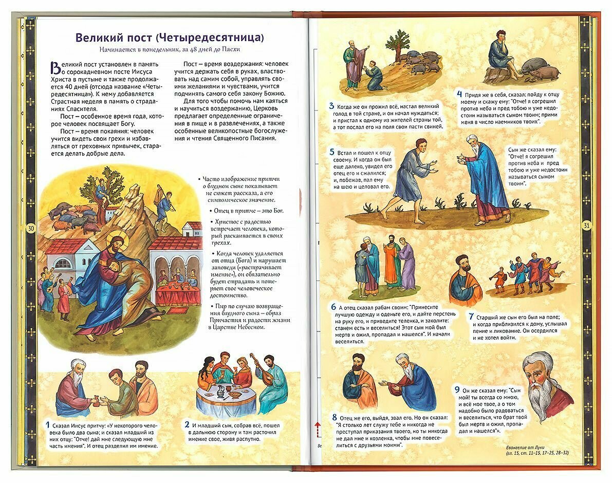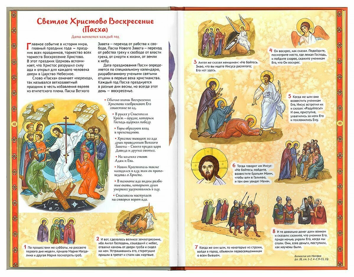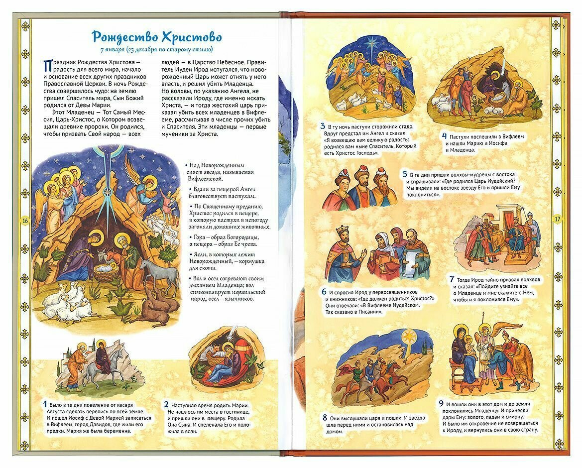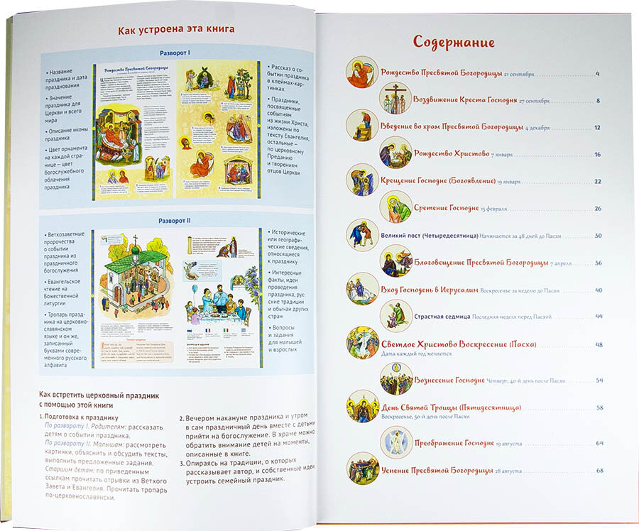 Красочно иллюстрированная книга Анны Сапрыкиной приглашает юного и взрослого читателя окунуться в мир Священной истории, в доступной и увлекательной форме рассказывает о самых главных праздниках Православной Церкви, об их смысле и значении. В издании предложено множество идей проведения праздников вместе с детьми, а также небольшие задания для малышей и взрослых. Дети научатся понимать, что изображено на иконах, что происходит на богослужении, получат интересные исторические сведения. Издание также может быть использовано как наглядное пособие на уроках по изучению основ православной культуры.