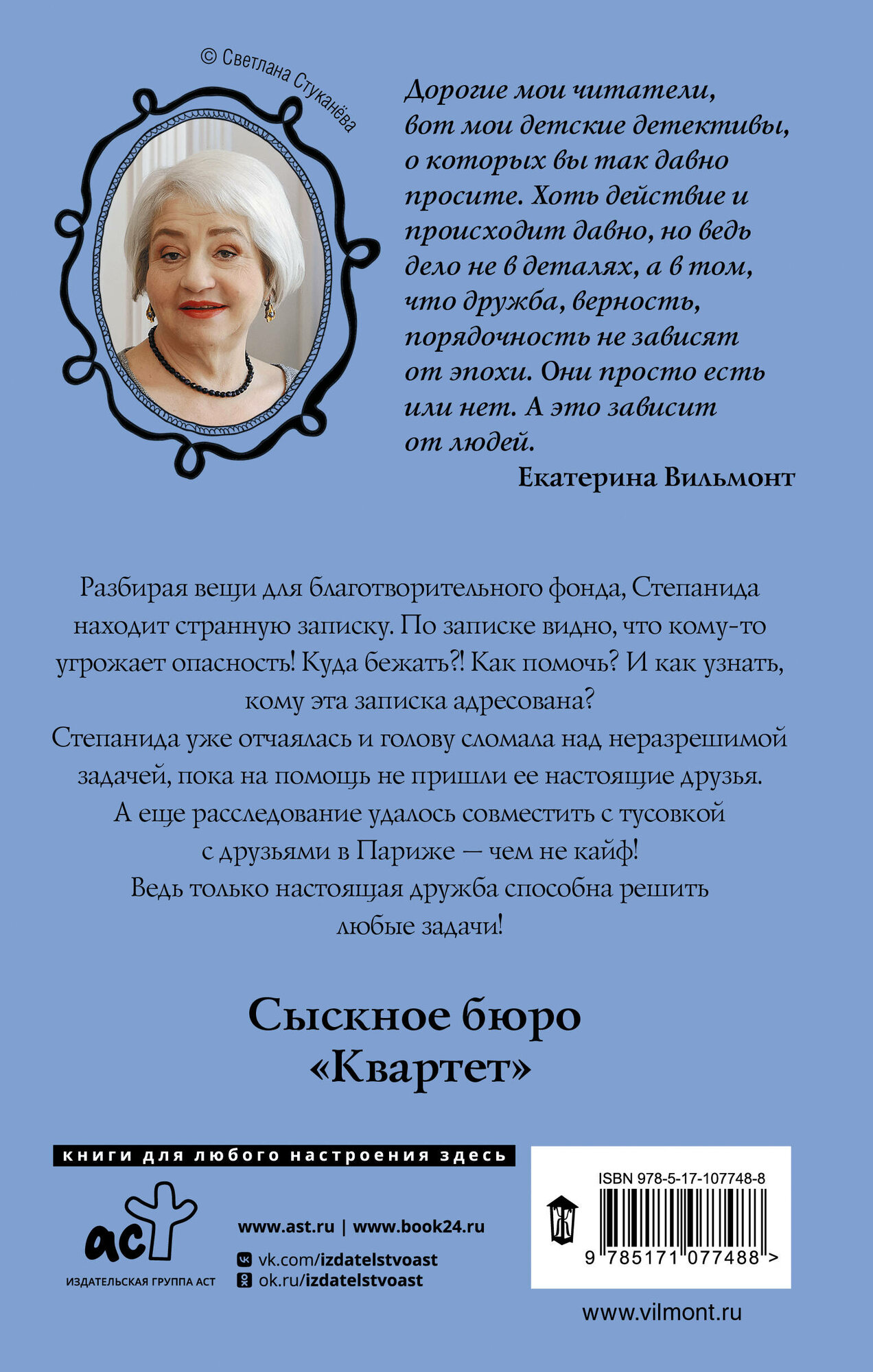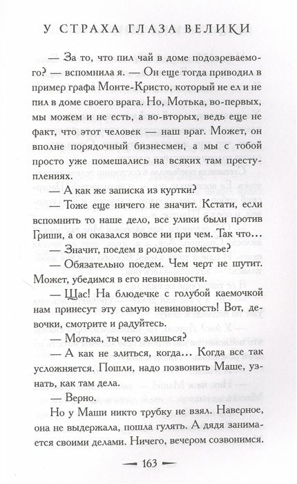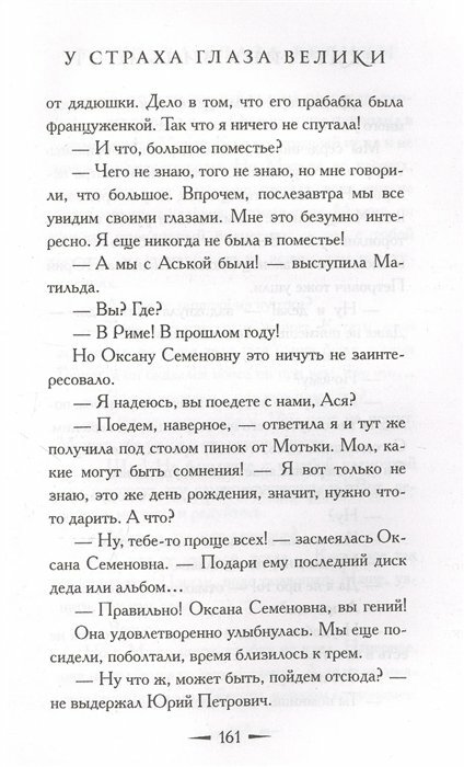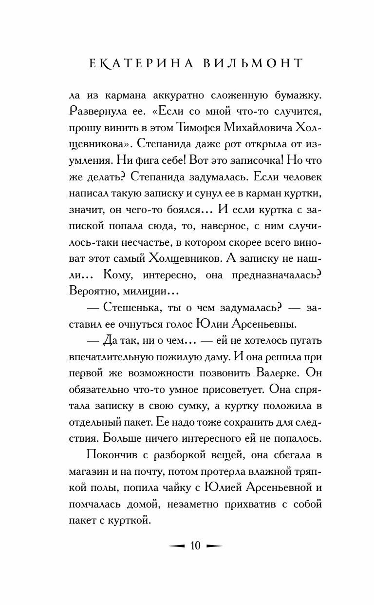 Книга интересная, немного скомкана концовка. Начну с самого начала. Степа учится и работает как прежде. При разборе благотворительных вещей для других актёров, находит странную записку. И вдруг они с Матильдой едут в Париж к Асе. Случайно в Париже, Степа находит визитку с такой же фамилией. И этот жуткий человек приглашает девочек к себе на день рождения. В книге как то пропущен день рождения Степаниды. И в конце книги этот нехороший человек убивает другого человека, хотя известный бизнесмен. И тут же едет совершать другое преступление. Тут его перехватывают девчонки и сдают полиции. Всё. Как то вот концовка не очень.