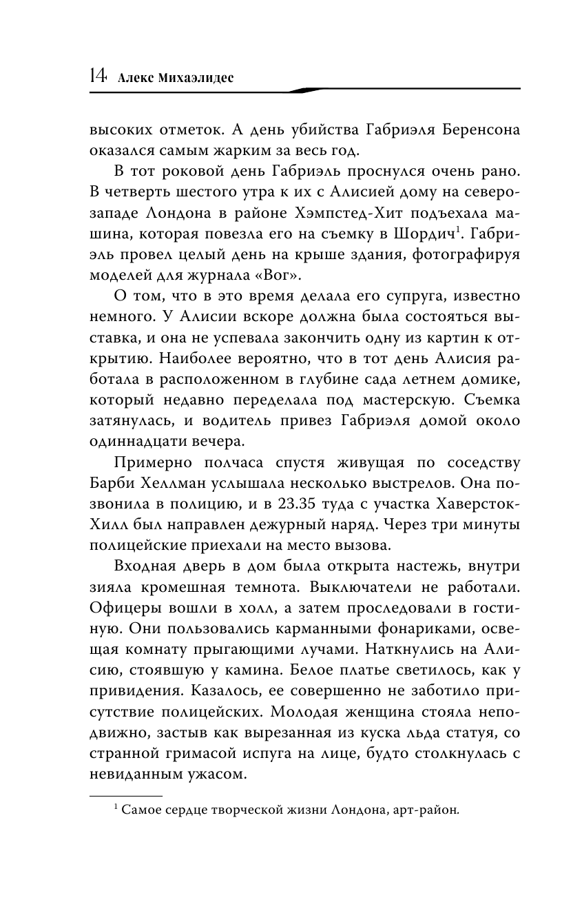 Жизнь Алисии Беренсон кажется идеальной. Известная художница вышла замуж за востребованного модного фотографа. Она живет в одном из самых привлекательных и дорогих районов Лондона в роскошном доме с большими окнами, выходящими в парк. Однажды поздним вечером, когда ее муж Габриэль возвращается домой с очередной съемки, Алисия пять раз стреляет ему в лицо. И с тех пор не произносит ни слова.