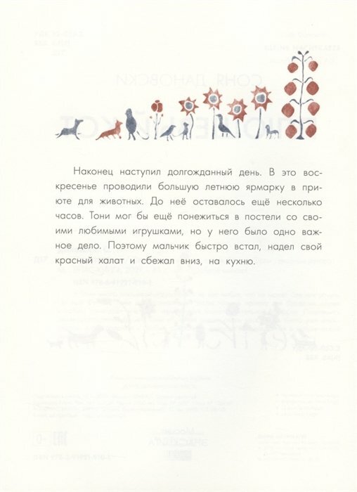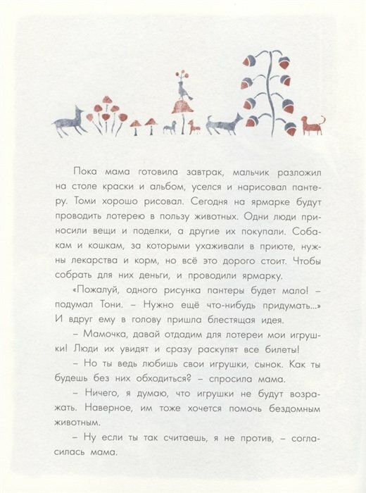 У Тони много плюшевых игрушек. Он их так любит, что не может без них уснуть. Но еще больше Тони любит животных. Чтобы помочь приюту для бродячих кошек и собак, он отдает все свои игрушки для благотворительной ярмарки. Лишившись своих драгоценных друзей, Тони обретает новых, очень необычных. Книга учит милосердию и состраданию к слабым существам, которые так нуждаются в человеческой защите. Эта трогательная история с волшебными иллюстрациями порадует любителей животных всех возрастов.