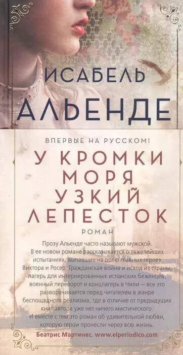 В названии своего нового романа «У кромки моря узкий лепесток» Исабель Альенде использовала строку Пабло Неруды. И это не случайно, ведь великий чилийский поэт и дипломат – один из важных персонажей книги, он помогает героям романа хирургу Виктору Далмау и пианистке Росер, а также тысячам беженцев выбраться из ада, когда под разрывами снарядов Гражданской войны «кровавой сделалась земля людей», земля Испании. Но кто знает, как сложатся судьбы этих потерявших все людей на новой родине?.. Что ждет их на этой узкой полосе земли между горными ледниками Анд и Тихим океаном?
