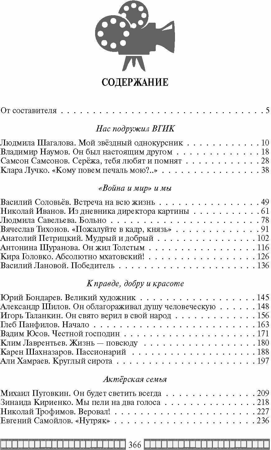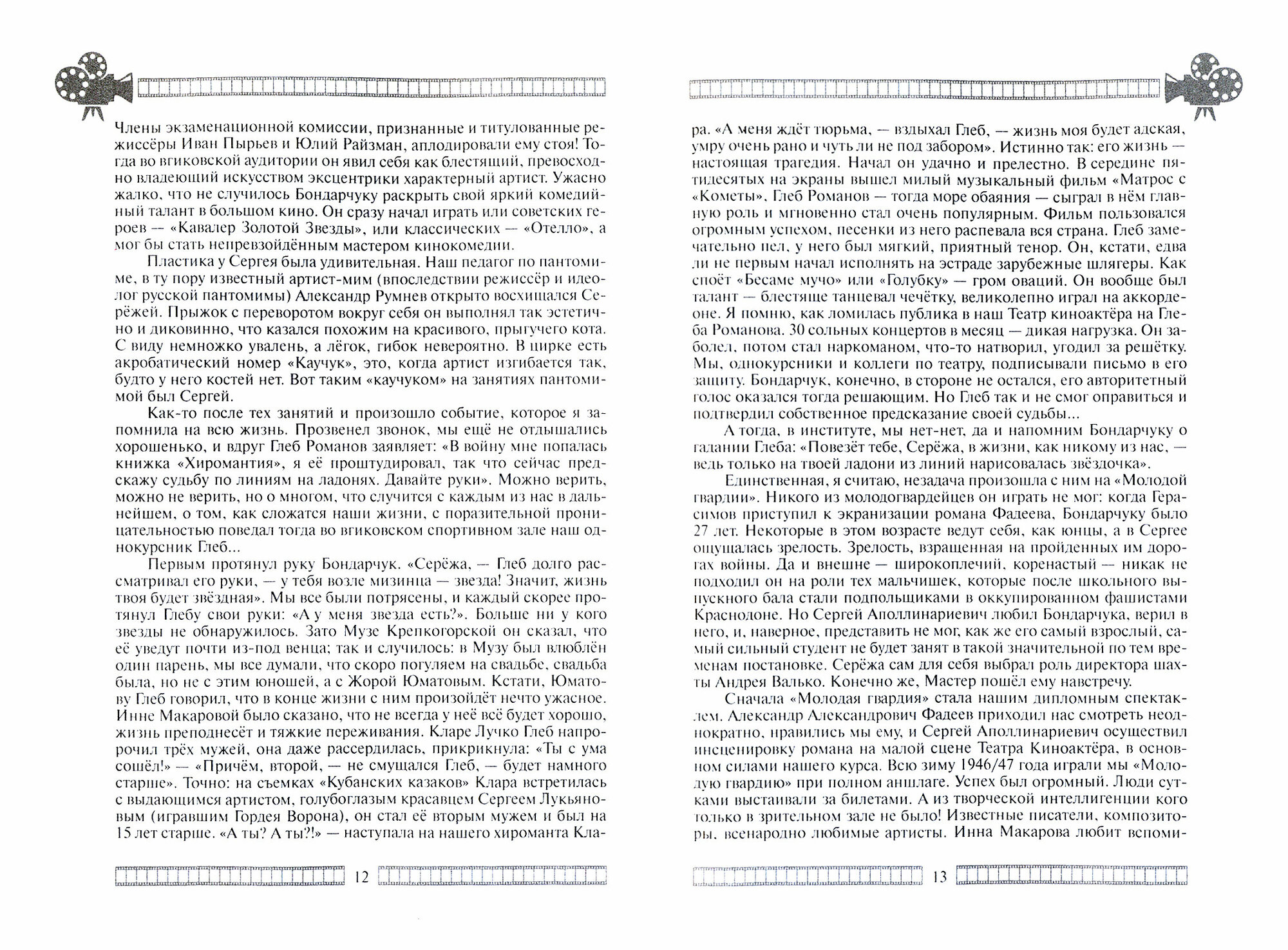 Новая книга, созданная совместным трудом многих журналистов, актеров, режиссёров, раскрывает творческий и жизненный путь гения. О яркой судьбе - о блистательном взлёте и последнем тернистом пути художника и человека, о днях счастья и днях борьбы с новым временем говорят спутники "планеты Бондарчук". Главная лирическая героиня всей жизни Сергея Фёдоровича - Ирина Константиновна и дети - Фёдор, Елена, Наталья; друзья и коллеги - Г. Данелия, А. Кончаловский, Н. Михалков, К. Шахназаров, В. Лановой и многие, многие звезды, согреваемые в лучах огромного светила советского и мирового кино, рассказывают о войне и мире Сергея Бондарчука.