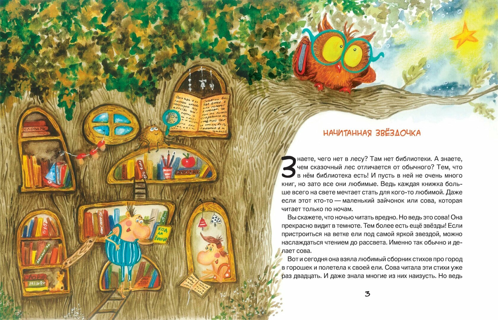 Честно, даже побаивалась читать, опасалась, вдруг окажется не такой волшебной как первая. Но все опасения оказались напрасны. Книга отличная! Мы с Настёной получили большую порцию доброты и чудес. Книгу я читала дочке перед сном, одну сказку за другой. Прерывались только для обсуждения, а тем для разговоров книга даёт предостаточно.В сказочном лесу, там где живут Лапа и Винчи, есть небольшая библиотека. Каждый книголюб знает, что в библиотеке главное не количество книг, главное, чтобы каждая книга была любима. С этим в лесной библиотеке проблем нет. Читателей у нее хоть отбавляй. Даже ночью приходят посетители, чтобы почитать стихи под луной. Звёзды, кстати, с большим удовольствием слушают, когда им читают вслух.Несмотря на то, что Лапа и Винчи лучшие друзья, у них абсолютно разные характеры. Лапа - человек дела. Придумал что-то, тут же воплощает в жизнь. А Винчи знатный мечтатель. Вот только однажды все его мечты собрались вместе и начали покусывать своего создателя. Вот тут-то и пришлось Винчи поучиться у своего друга воплощать мечты в жизнь. Как говорится: "Сказка - ложь, да в ней намек! Добрым молодцам урок." Хорошая тема для обсуждения с детьми.Есть в этой книге сказка про любовь. В ней раскрывается секрет, как понравится принцессе. Хотя работает он со всеми, даже если объект вашего обожания совсем не голубых кровей.В другой сказке здорово показано, что мир вокруг - это отражение нашего внутреннего мира. Наполняете себя добротой, любовью, тогда каждая мелочь будет радовать, в каждой ситуации нужно уметь видеть хорошее.Вот такие теплые, уютные, добрые сказки пишет Ольга Добросовестная. А яркие, весёлые иллюстрации Сони Облачко отлично дополняют книгу. Это именно тот случай, когда художник является соавтором. Других Лапу и Винчи даже представить не могу.) В книге есть даже карта Сказочного леса, ну и конечно, наш обожаемый паучок.)))