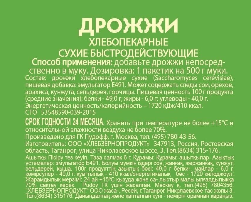 | Состав | Дрожжи хлебопекарные сухие, эмульгатор Е491. |