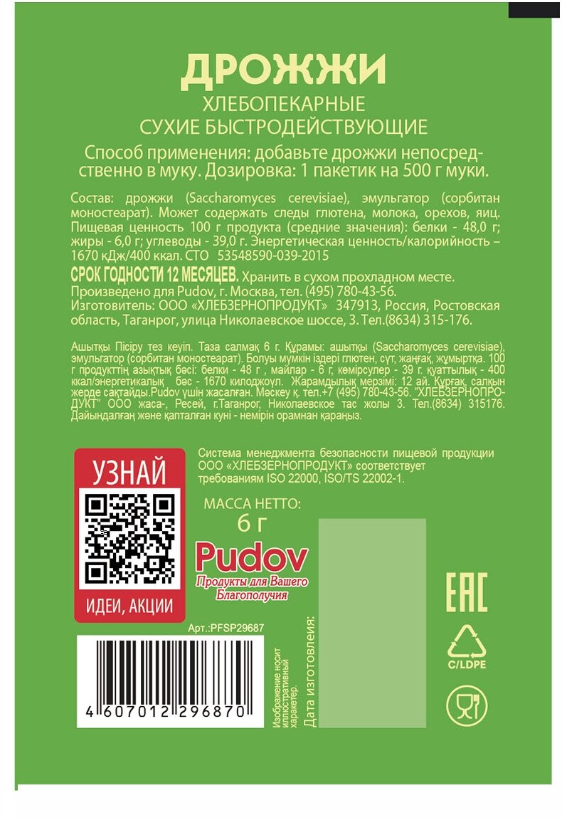 Дрожжи С.Пудовъ экологически чистый продукт, рекомендованный к использованию для всех видов домашней выпечки: хлеба, пирогов, печенья и т.д.