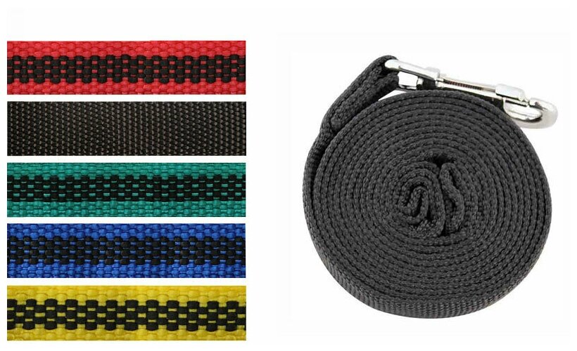 Прочный, долговечный и надежный капроновый поводок длиной 5 метров при ширине 16 мм. Поводок применяется для прогулок и дрессировки собаки. Изделие снабжено надежным карабином из высококачественной стали, а специальный переходник позволяет карабину крутиться вокруг своей оси, предотвращая запутывание. На поводке имеется петля, которая одевается на руку для более удобного использования.