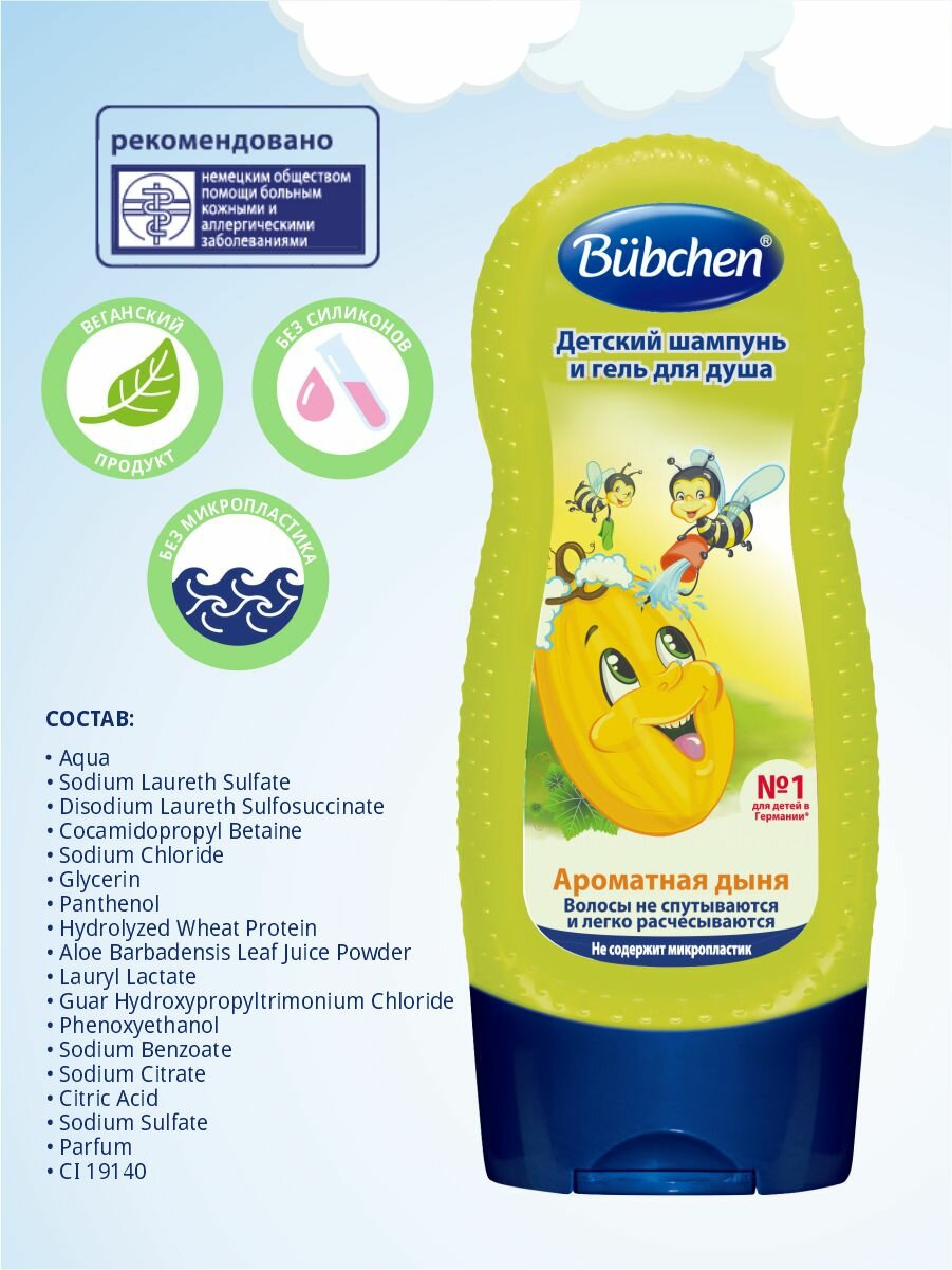 Для нежного очищения волос и кожи. С фруктовым ароматом дыни, который делает мытье волос и купание настоящим удовольствием. Совмещает в себе шампунь и гель для душа. Бережно очищает, ухаживает за кожей и придает волосам шелковый блеск. После мытья волосы легко расчесываются. Использовать с 3-х лет.