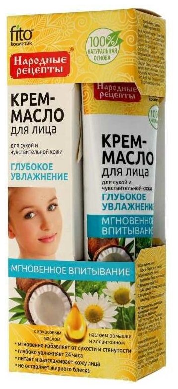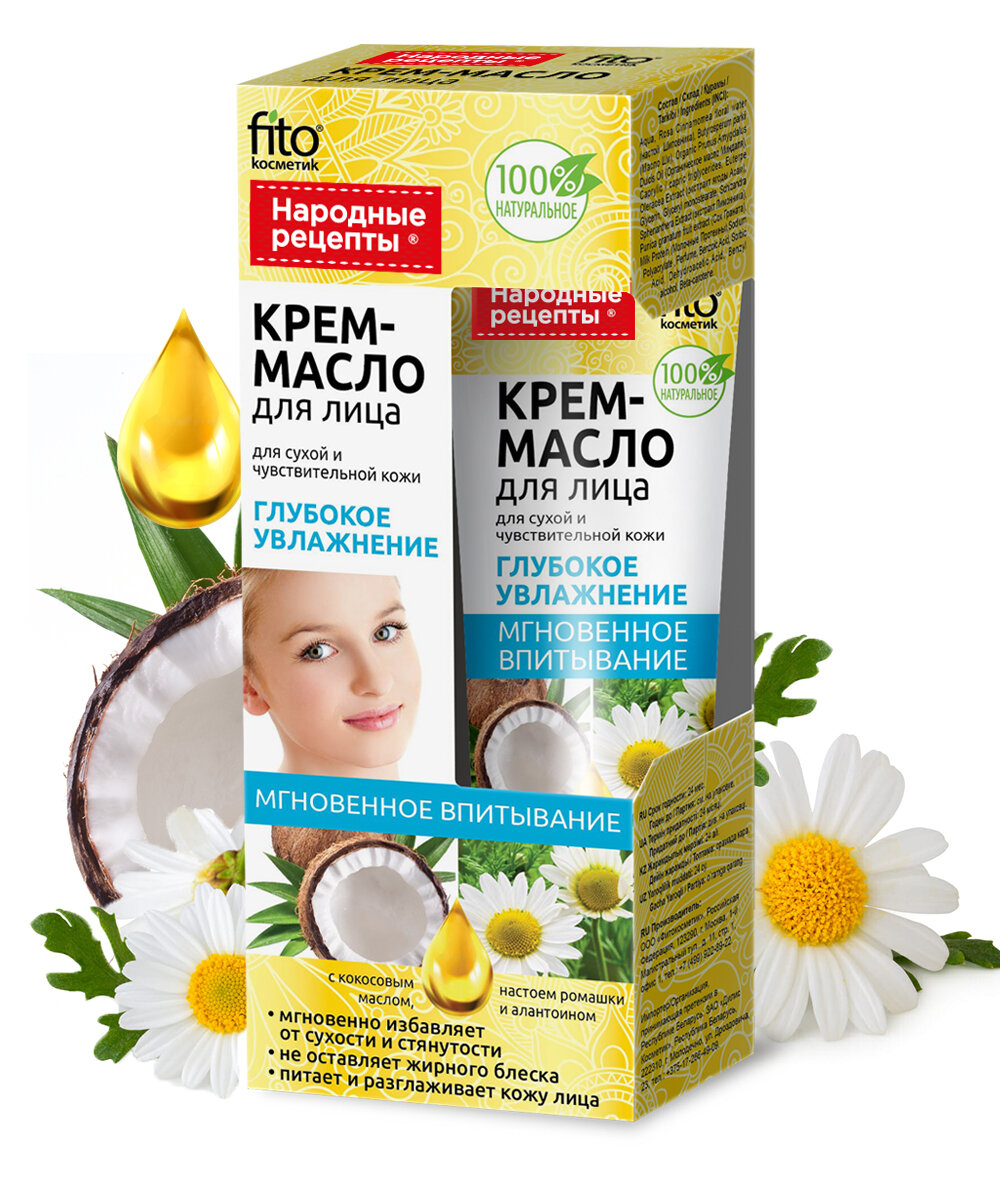 Крем-масло для лица «Глубокое увлажнение» с кокосовым маслом, настоем ромашки и аллантоином (для сухой и чувствительной кожи) мгновенно впитывается, мгновенно избавляет от сухости и стянутости, не оставляет жирного блеска.