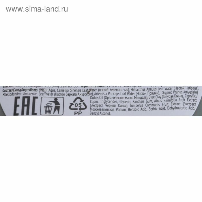| Состав | Aqua, Camellia Sinensis Leaf Water (настой Зеленого чая), Helianthus Annuus Leaf Water (Настой Чабреца), Phellodendron Amurense Leaf Water (Настой Бархата Амурского), Artemisia Princeps Leaf Water (Настой Полыни), Оrganic Prunus Amygdalus Dulcis Oil (Органическое масло Миндаля), Blue Clay (Голубая Глина), Caprylic / Capric Triglycerides, Glycerin, Xanthan Gum, Alnus Firmifolia Fruit Extract (Экстракт Черной Ольхи), Juniperus Communis Fruit Extract (Экстракт Можжевельника), Parfum, Benzoic Acid, Sorbic Acid, Dehydroacetic Acid, Benzyl Alcohol |