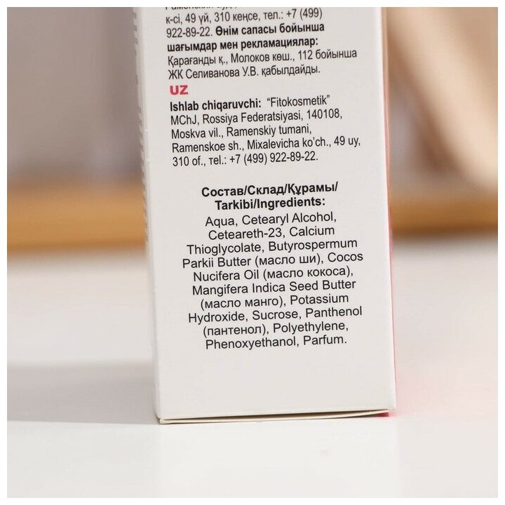 | Состав | Aqua, Cetearyl Alcohol, Ceteareth-23, Calcium Thioglycolate, Argania Spinosa Kernel Oil (масло арагны), Butyrospermum Parkii Butter (масло ши), Potassium Hydroxide, Aloe Barbadensis Leaf Extract (экстракт алоэ), Panthenol (пантенол), Tocopheryl Acetate (витамин Е), Phenoxyethanol, Parfum. |