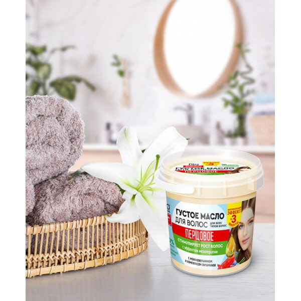 Масло для волос Народные рецепты Густое Перцовое стимулирует рост густых, здоровых, прочных и послушных волос, останавливает выпадение волос, делает их густыми, сильными и прочными. С эффектом мезотерапии.