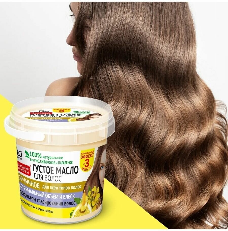 Масло для волос Народные рецепты Густое Горчичное укрепляет, интенсивно питает, придает упругость, предотвращает ломкость и сечение волос, восстанавливает цвет, придает объем и сияющий блеск.