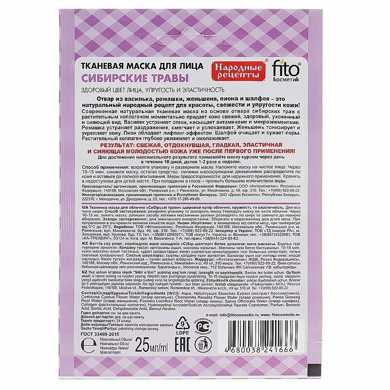 Маска тканевая для лица сибирские травы серии народные рецепты fito косметик 25 мл Фитокосметик ООО (503990)