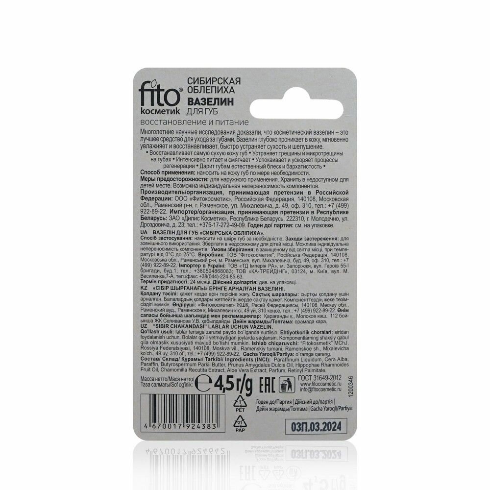 Вазелин для губ сибирская облепиха восстановление и питание fito косметик 4.5 г Фитокосметик ООО (503990)