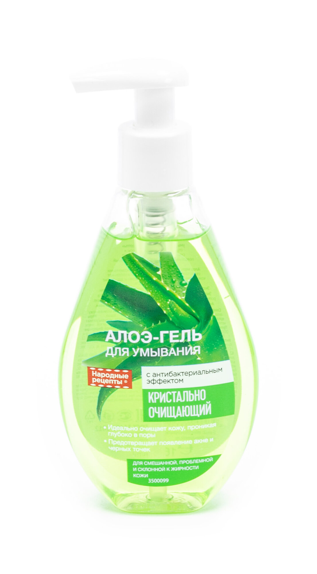 Гель Народные рецепты Алоэ-гель кристально очищающий с антисептическим эффектом на 90% состоит из сока и гидролата легендарного алоэ. Алоэ, известное своими чудодейственными свойствами мгновенно успокаивает и увлажняет кожу, нормализует работу сальных желез и дарит коже атласную матовость.
