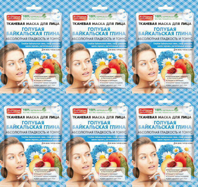 В комплекте 6 шт Современная натуральная тканевая маска на основе голубой байкальской глины с растительным коллагеном мгновенно восстанавливает гладкость и упругость кожи, насыщает витаминами, дарит ей здоровый, свежий, ухоженный вид. Голубая глина великолепно очищает и тонизирует кожу, отвар ромашки глубоко увлажняет, масло персика активно питает и омолаживает, растительный коллаген устраняет морщинки, повышает эластичность кожи.