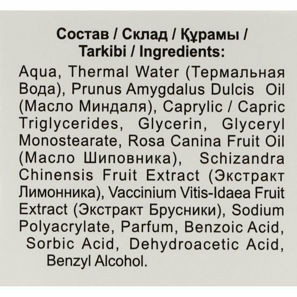 | Состав | Aqua, thermal water (термальная вода), prunus amygdalus dulcis oil (масло миндаля), caprylic (capric triglycerides), glycerin, glyceryl monostearate, prunus persica kernel oil (масло персика), coffea arabica seed extract (экстракт зеленого кофе), calendula officinalis flower extract (экстракт календулы), sodium polyacrylate, parfum, benzoic acid, sorbic acid, dehydroacetic acid, benzyl alcohol. |