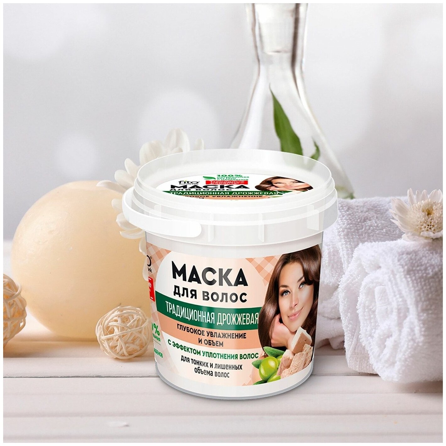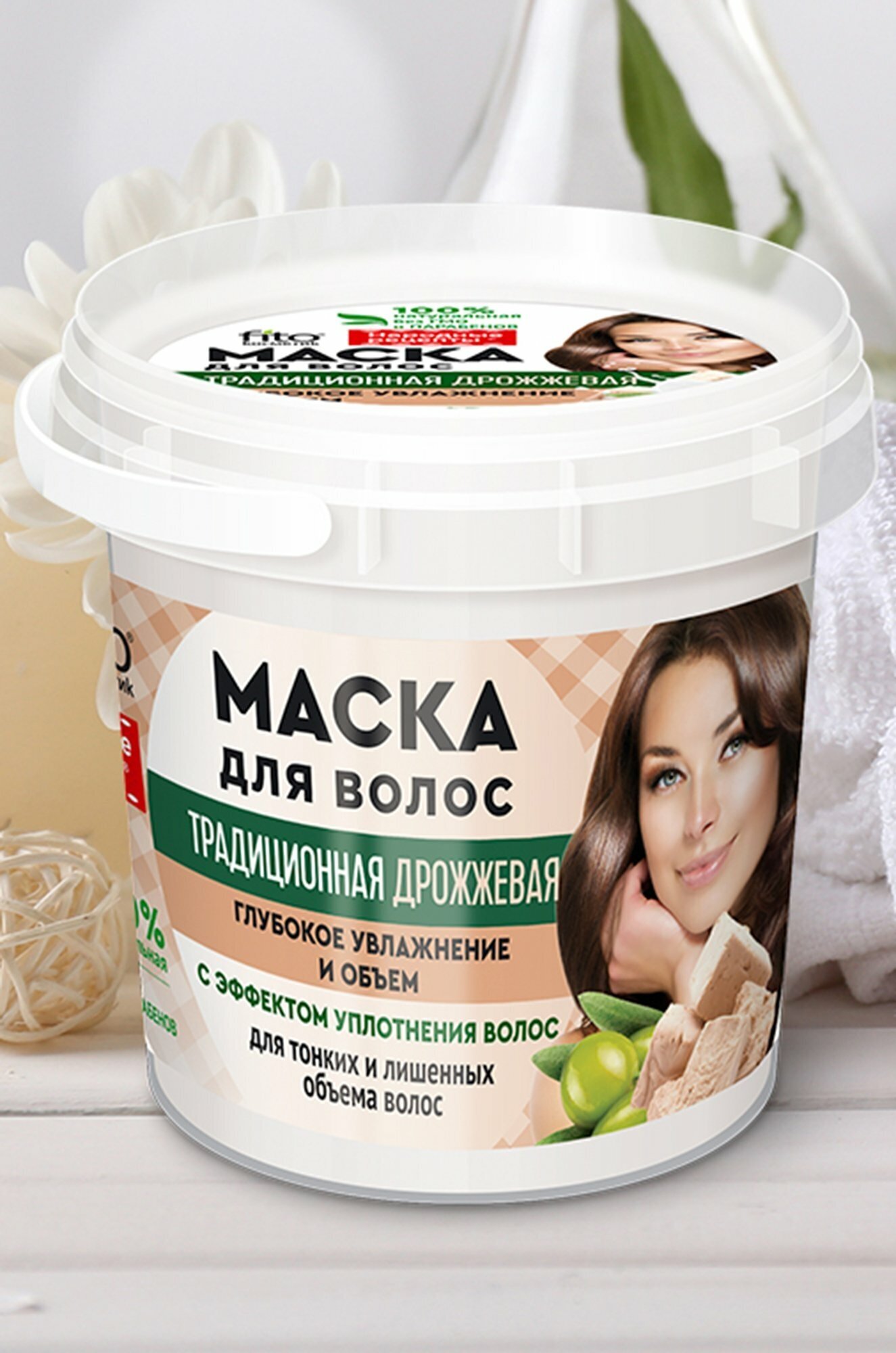 Натуральная дрожжевая маска мгновенно насыщает волосы влагой, делает их более плотными, упругими, шелковистыми и объемными. Входящие в состав молочная сыворотка и оливковое масло стимулируют рост здоровых и сильных волос, придают им гладкость и роскошный блеск.